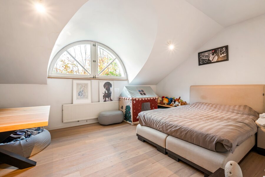 De bovenste verdieping biedt een zeer ruime ingerichte zolder, die momenteel dienst doet als fitnessruimte. Deze open ruimte kan ook dienen als speelzolder, extra slaapkamer, atelier of opslag.