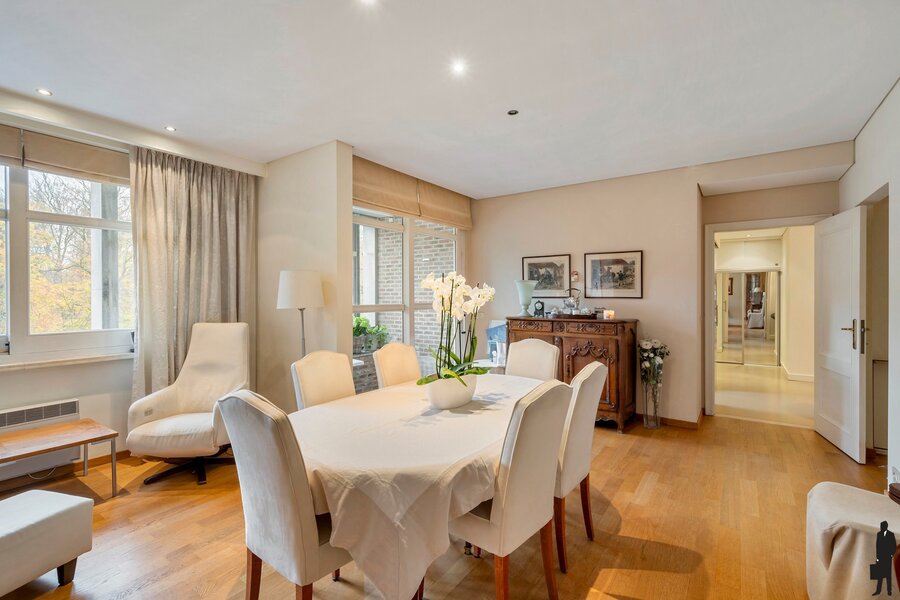 - Ruime eetkamer op eiken parket met maatkasten en bureauhoek, toegang tot het overdekte tweede terras.