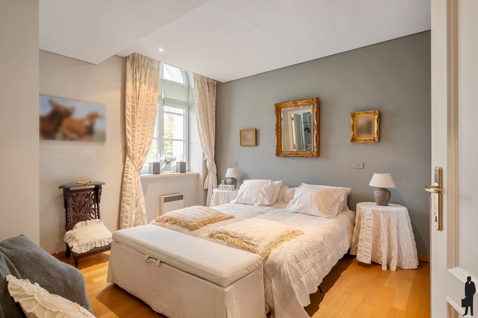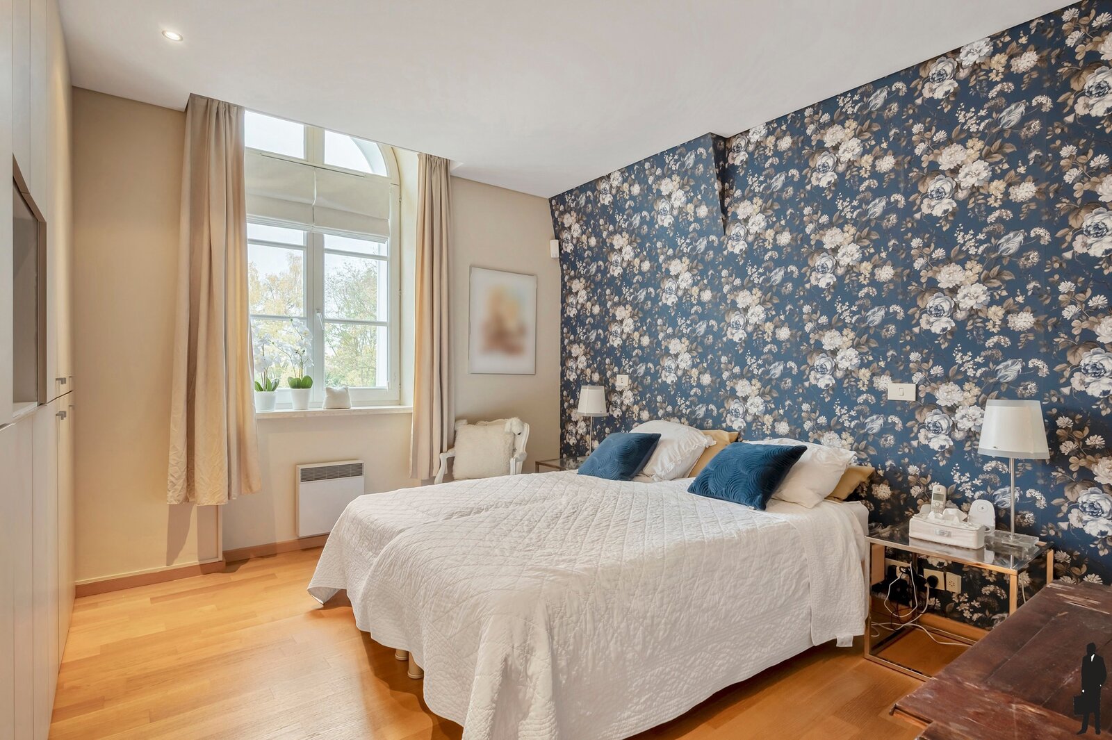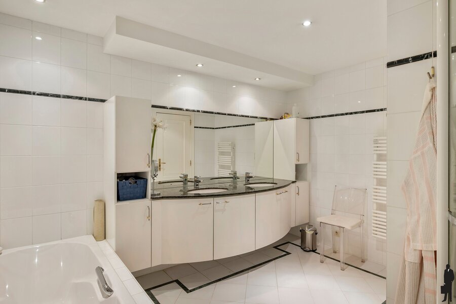 - Masterbedroom met ingemaakte kasten en ensuite badkamer (ligbad, douche, dubbele lavabo, toilet).
