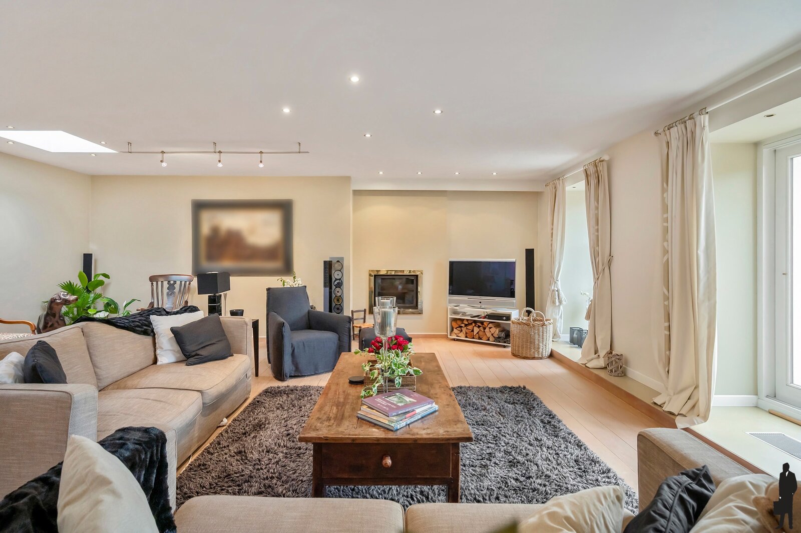 - Leefruimte met prachtig hoog plafond, eiken parket, open haard en home-cinemasysteem (speakers & beamer).