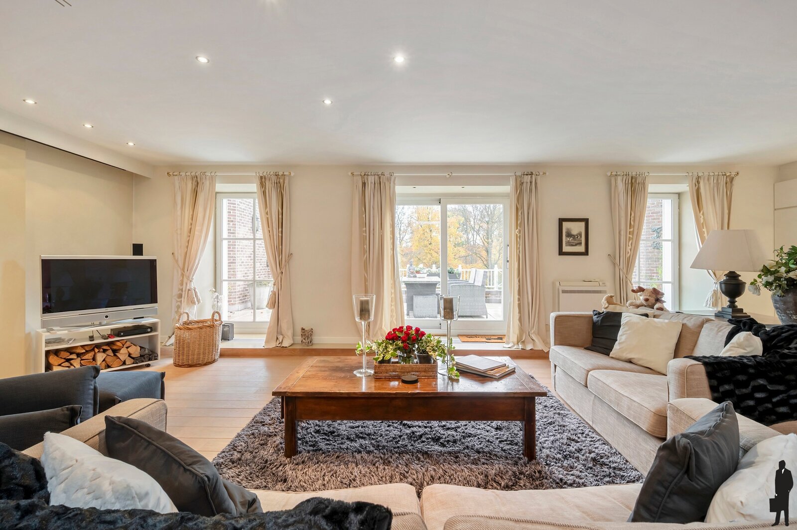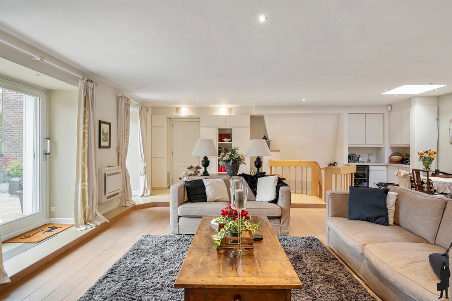- Toegang via 3 kamerhoge deuren tot het grote terras met uniek zicht op het park en de vijver.
