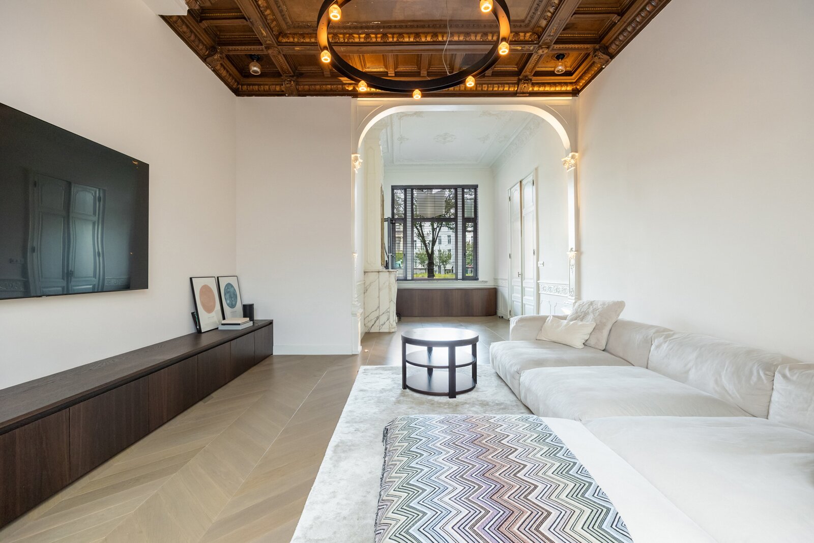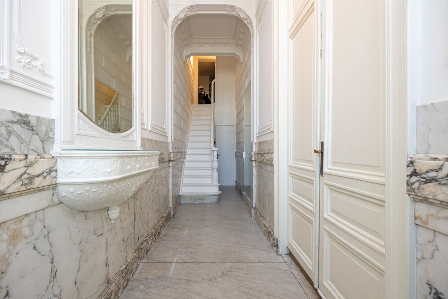 Private entrance with marble, two beautiful rooms with high ceilings, original ceilings and fireplace. At the front possibly reception room or office.