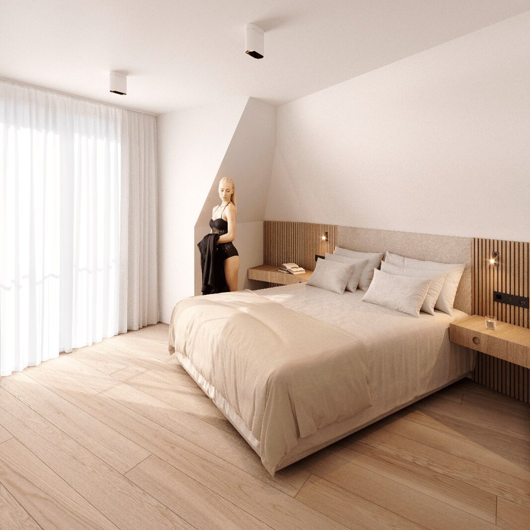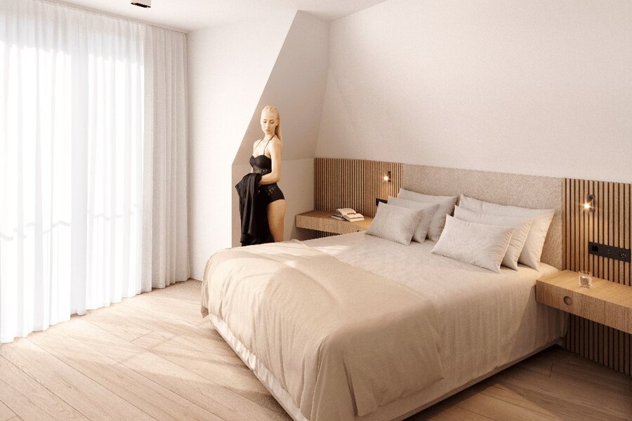 De master bedroom beschikt over een eigen douchekamer met douche, lavabo en toilet. Daarnaast is er een tweede ruime slaapkamer met plaats voor een dubbel bed en een eigen balkon. De derde, meer compacte kamer kan perfect dienen als kinder-, logeer- of bureauruimte. Op de nachthal bevindt zich een tweede badkamer, uitgerust met een douche en dubbele wastafel.