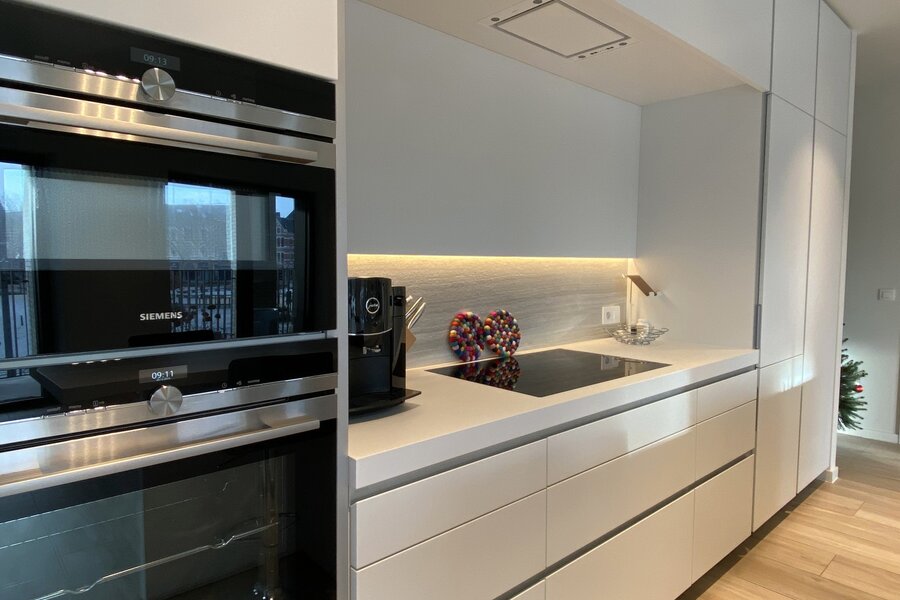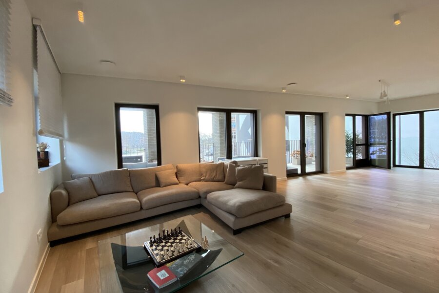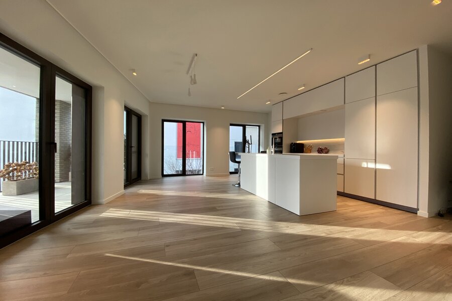 The apartment is fitted throughout with tasteful, light parquet flooring on wide planks, tastefully combined with customised features and recessed lighting. All this creates a harmonious whole.