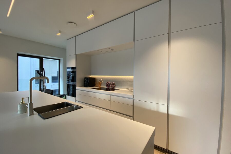 The open kitchen features white composite worktops, white furniture and high-quality Miele appliances (oven, steam oven, large induction hob with integrated extractor hood, dishwasher, refrigerator, freezer). A cosy breakfast bar completes the look.