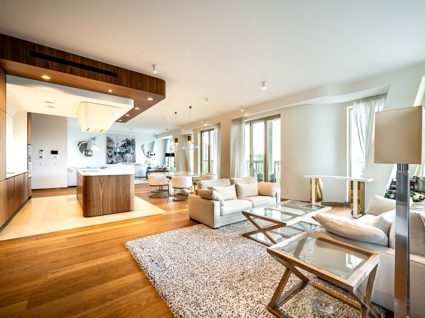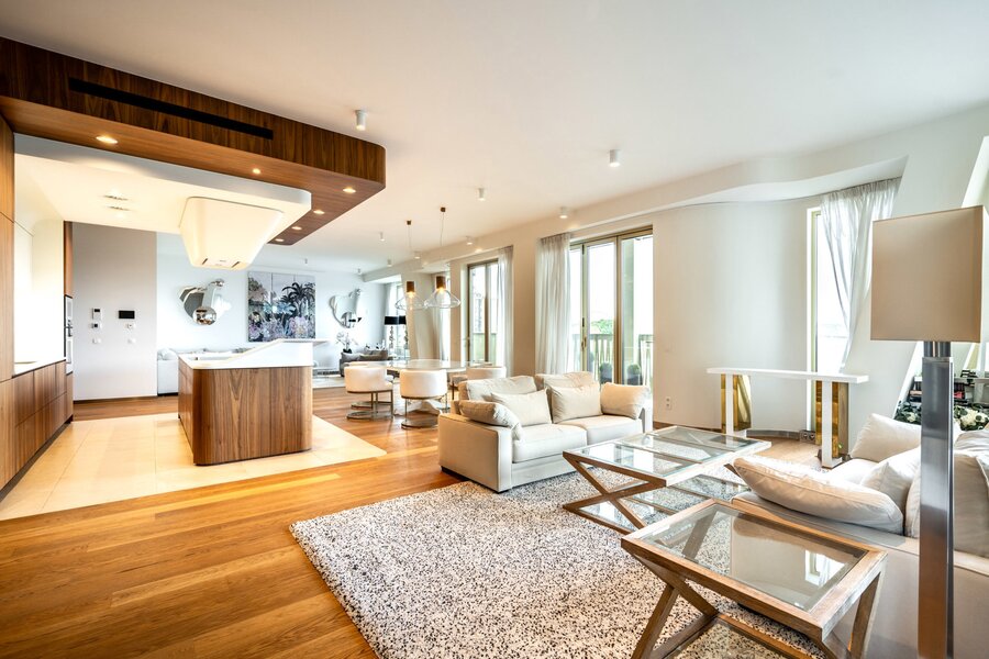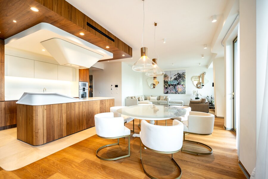 The apartment features an entrance hall with a cloakroom and guest toilet, a spacious living and dining area of approximately 150 m² with a fully equipped Gaggenau open-plan kitchen, all opening onto a first west-facing terrace. The sleeping area comprises the master bedroom with a dressing room, a full bathroom, and access to a second terrace. The two other bedrooms share a full bathroom and each also has access to a terrace.