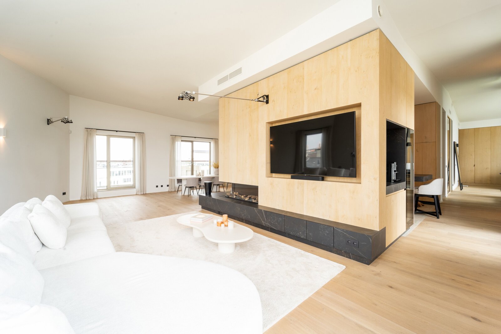 Hier wordt u verwelkomt in een zeer lichte en ruime leefruimte waar de grote raampartijen en hoge plafonds voor een overvloed aan natuurlijk licht zorgen.