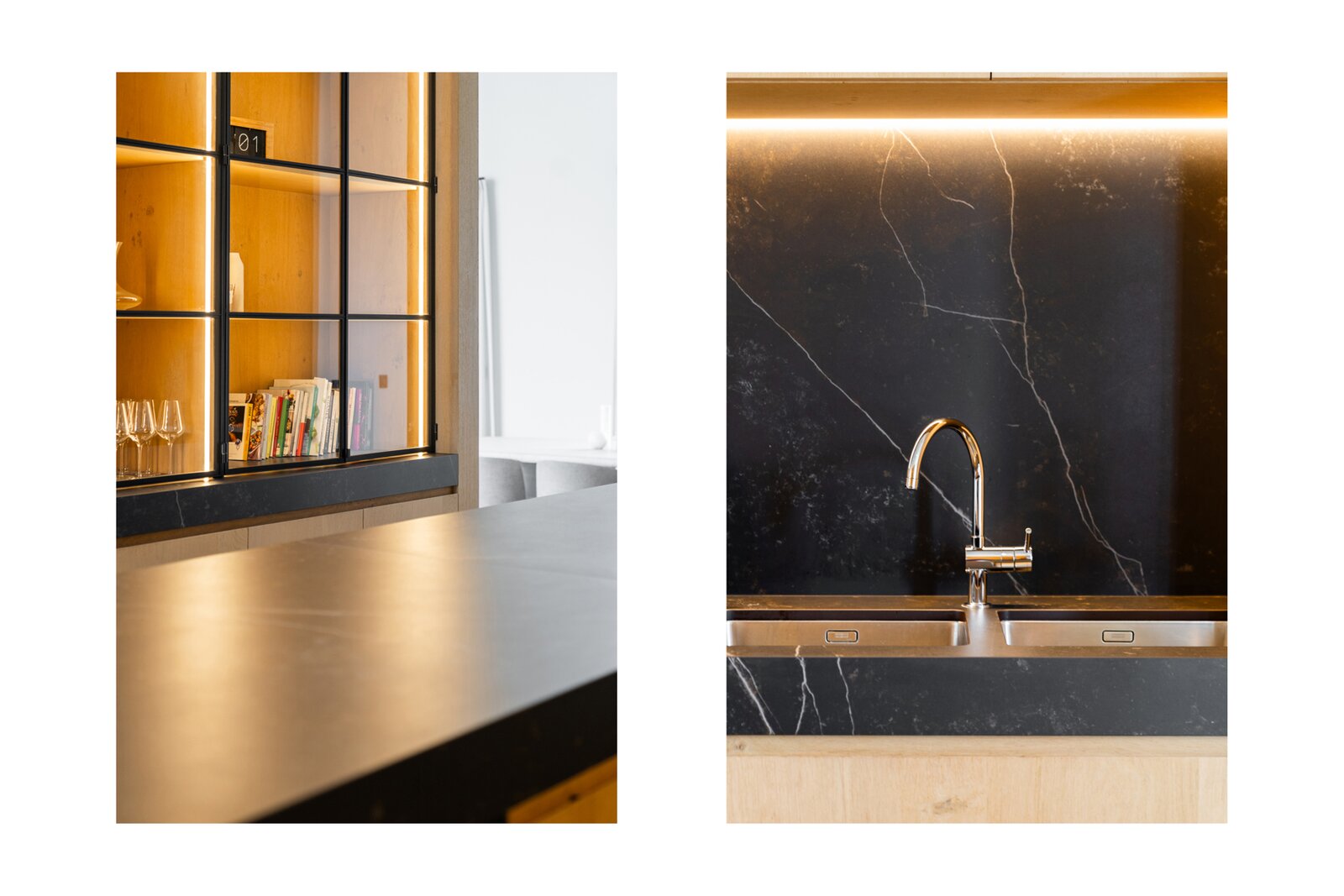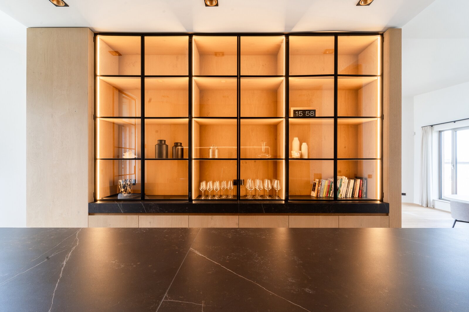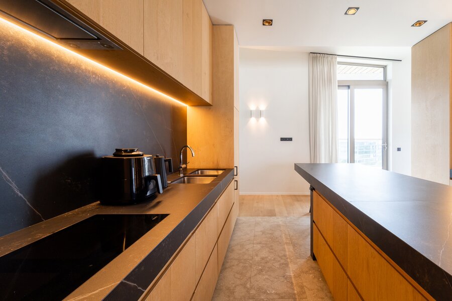 De open keuken is tot in de puntjes afgewerkt met hoogwaardige materialen en voorzien van de beste toestellen. Deze is ook voorzien van coffee corner en een ingemaakte wijnkoeling.