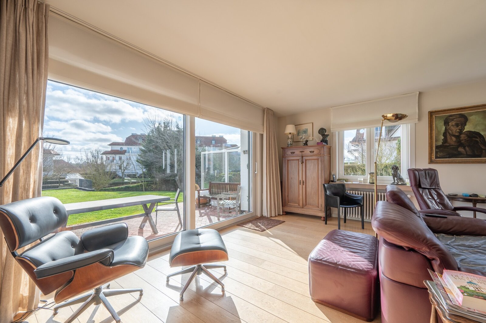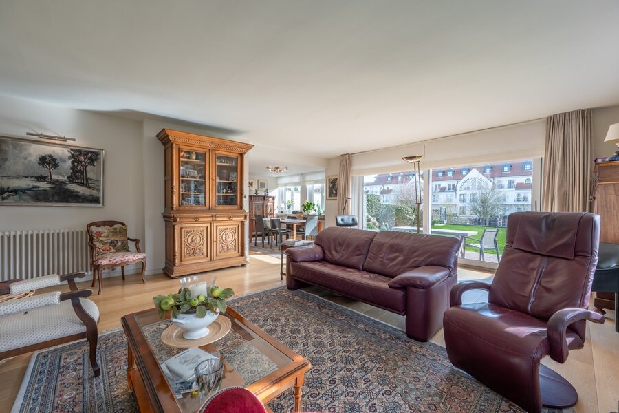 EXCLUSIEF TE KOOP: Zeldzaam hoek-tuinappartement, gelegen in een prestigieuze villaresidentie ter hoogte van de Wandeldijk, op slechts enkele stappen van het strand en de zee. Dit uitzonderlijke appartement beschikt over een privatieve tuin en ruim terras met een perfecte oriëntatie. Dankzij de hoekligging geniet u van een open, groen uitzicht en een sublieme lichtinval gedurende de hele dag. Indeling: Stijlvolle inkomhal met gastentoilet en vestiaire. De royale, lichtrijke leefruimte met gashaard sluit harmonieus aan op de open keuken, zithoek en eetplaats. Grote raampartijen bieden directe toegang tot het terras en de tuin, waar u in alle rust en privacy van de zon kunt genieten. De master bedroom beschikt over een en-suite badkamer met toilet en een dressing. Daarnaast zijn er twee volwaardige dubbele slaapkamers en een douchekamer. Het appartement is voorzien van elektrische rolluiken en beschikt over een ruime privatieve kelder en een fietsenberging. Er is tevens mogelijkheid tot aankoop van een dubbele staanplaats in de residentie. De gevel en de luiken van de residentie werden volledig herschilderd in 2025. Contacteer Knokke Real Estate voor een bezoek en ontdek dit unieke aanbod.