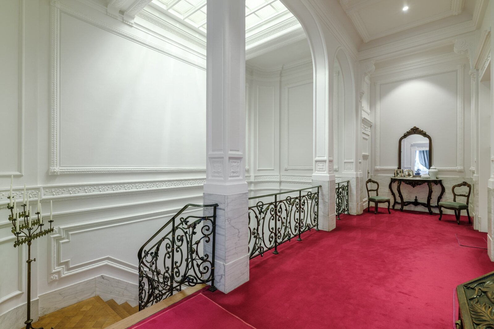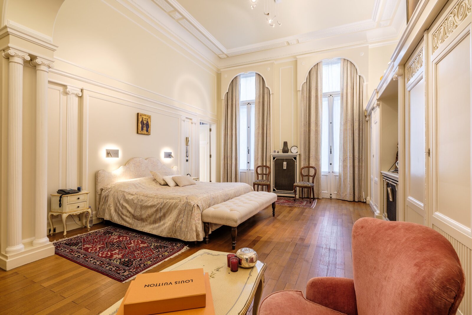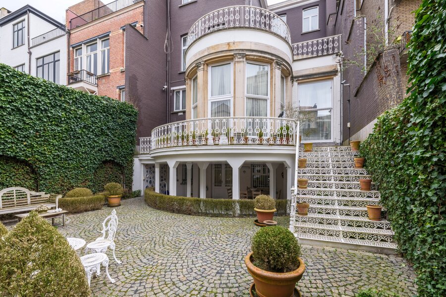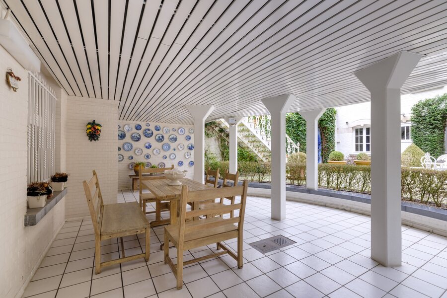 De statige gevel en majestueuze traphal zetten meteen de toon. Op het gelijkvloers vind je meerdere stijlvolle leefruimtes met hoge plafonds, sierlijke moulures en parketvloeren. Hier bevinden zich een salon, een eetkamer en een extra woonkamer met toegang tot de tuin. De gesloten keuken is volledig uitgerust en eveneens verbonden met het terras.