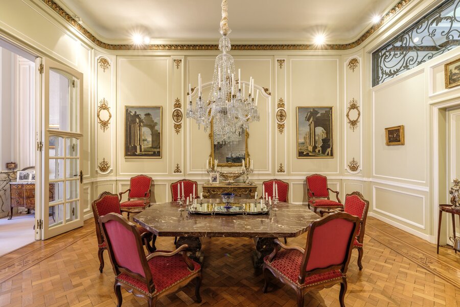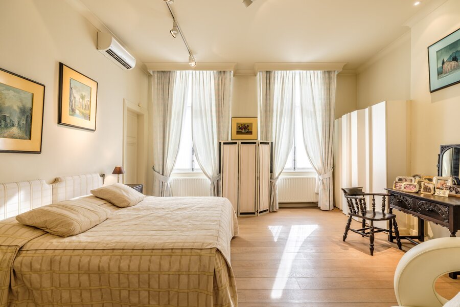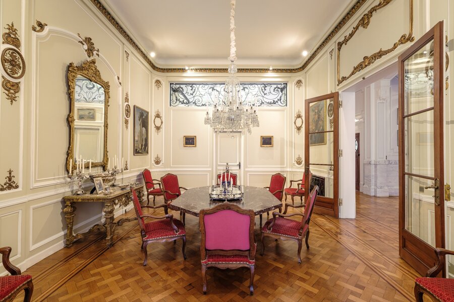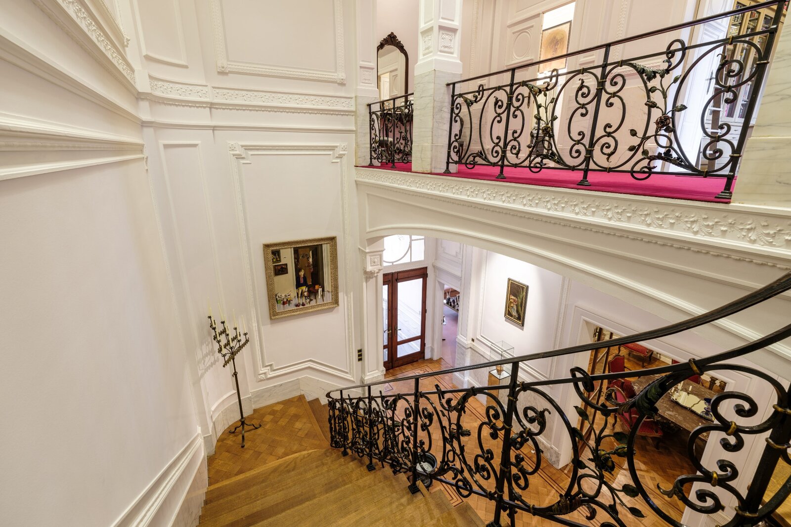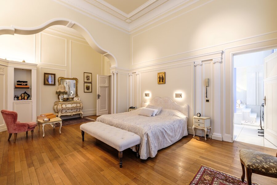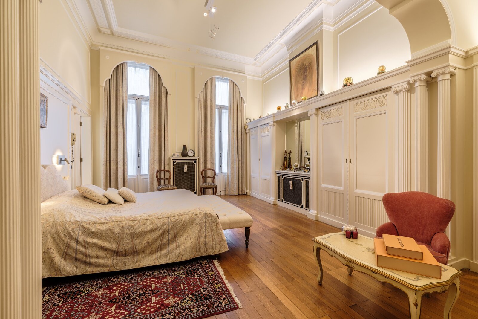 De statige gevel en majestueuze traphal zetten meteen de toon. Op het gelijkvloers vind je meerdere stijlvolle leefruimtes met hoge plafonds, sierlijke moulures en parketvloeren. Hier bevinden zich een salon, een eetkamer en een extra woonkamer met toegang tot de tuin. De gesloten keuken is volledig uitgerust en eveneens verbonden met het terras.