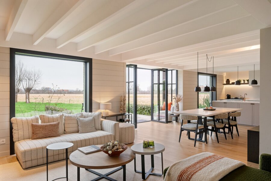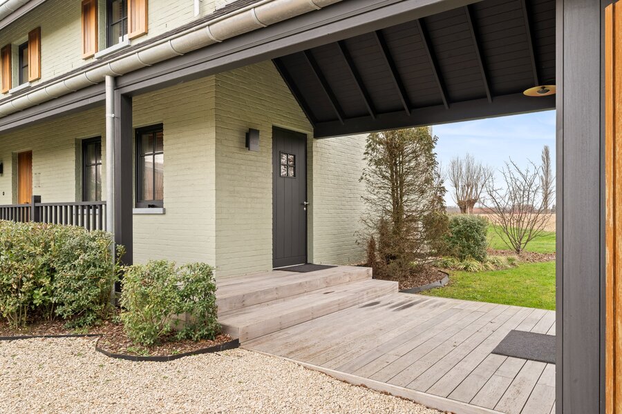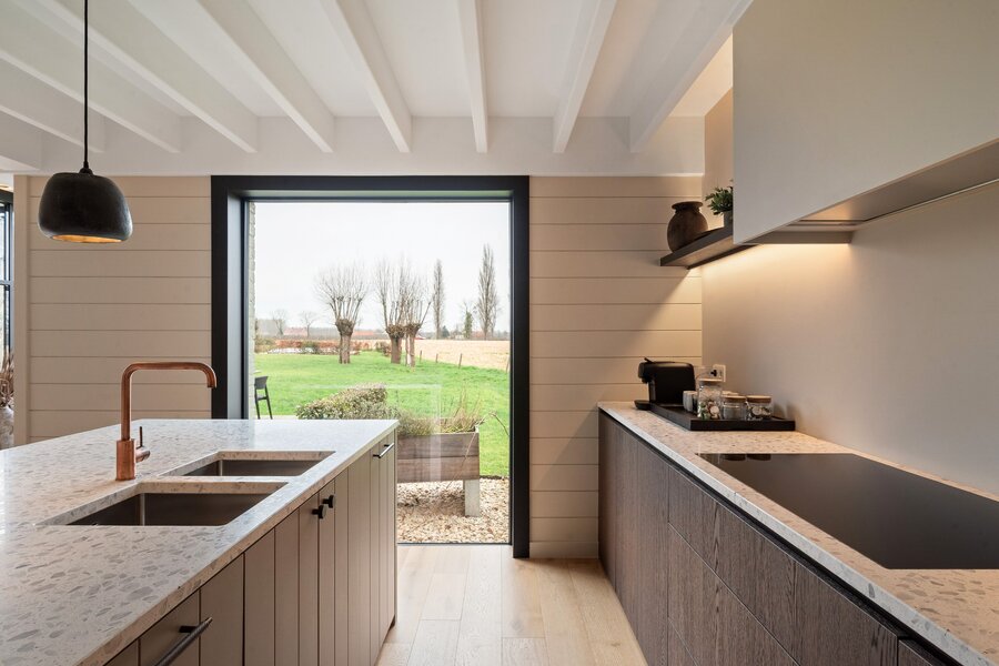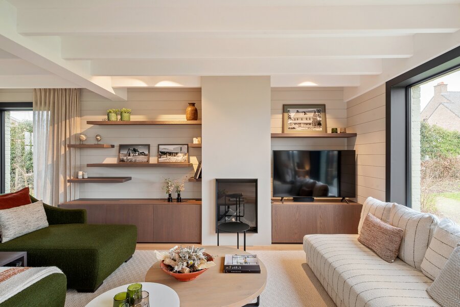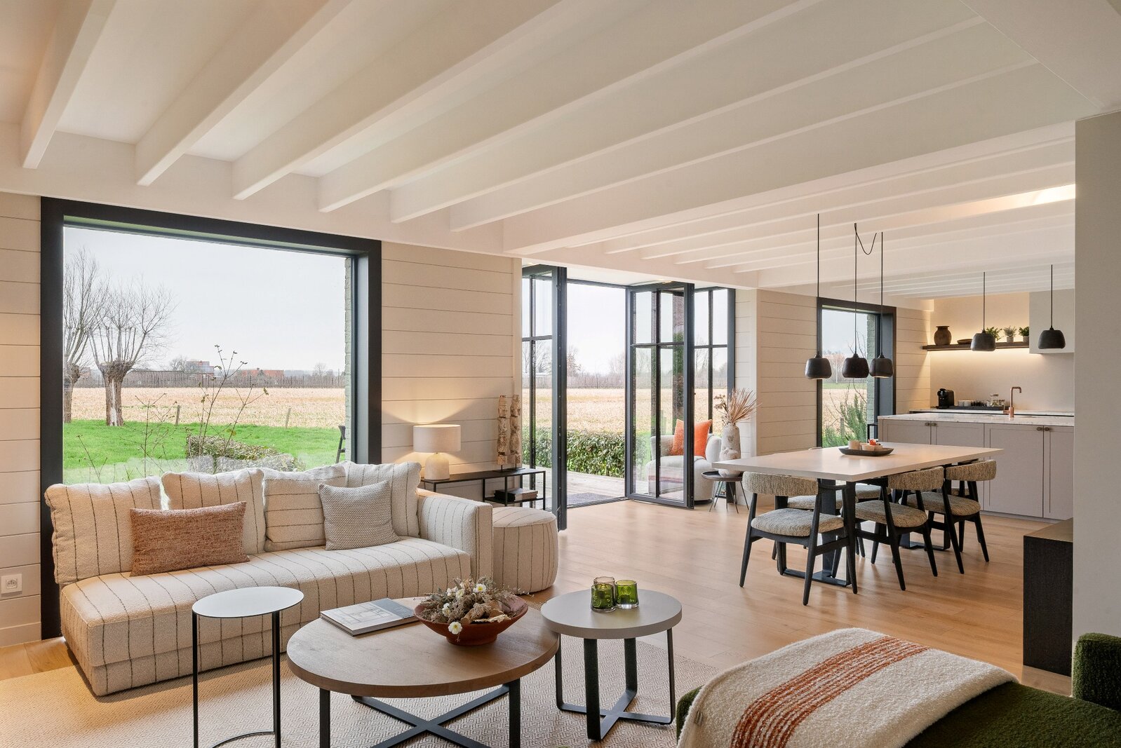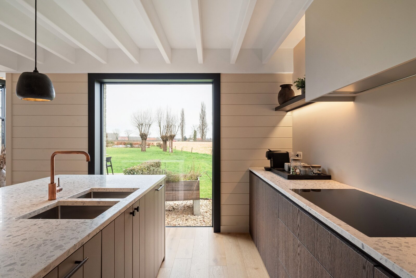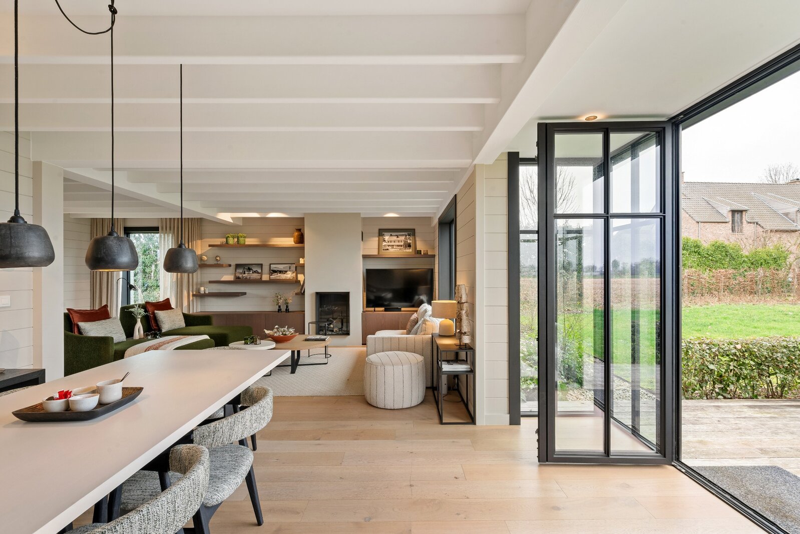 Bij binnenkomst verwelkomt de ruime inkomhal met gastentoilet u en zet meteen de toon voor de rest van het huis. De open leefkeuken met kwaliteitsvolle toestellen vormt het hart van de woning en sluit naadloos aan op de eetplaats en leefruimtes. Dankzij de grote raampartijen, volledig georiënteerd op de tuin, vloeien binnen- en buitenleven harmonieus in elkaar over. De leefruimtes zijn voorzien van vloerverwarming voor optimaal comfort. Aansluitend bevindt zich een praktische wasplaats met extra bergruimte en buitendeur.