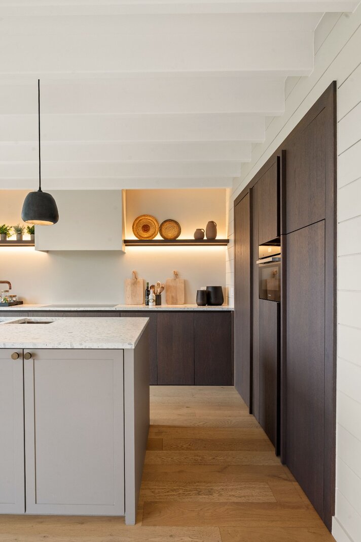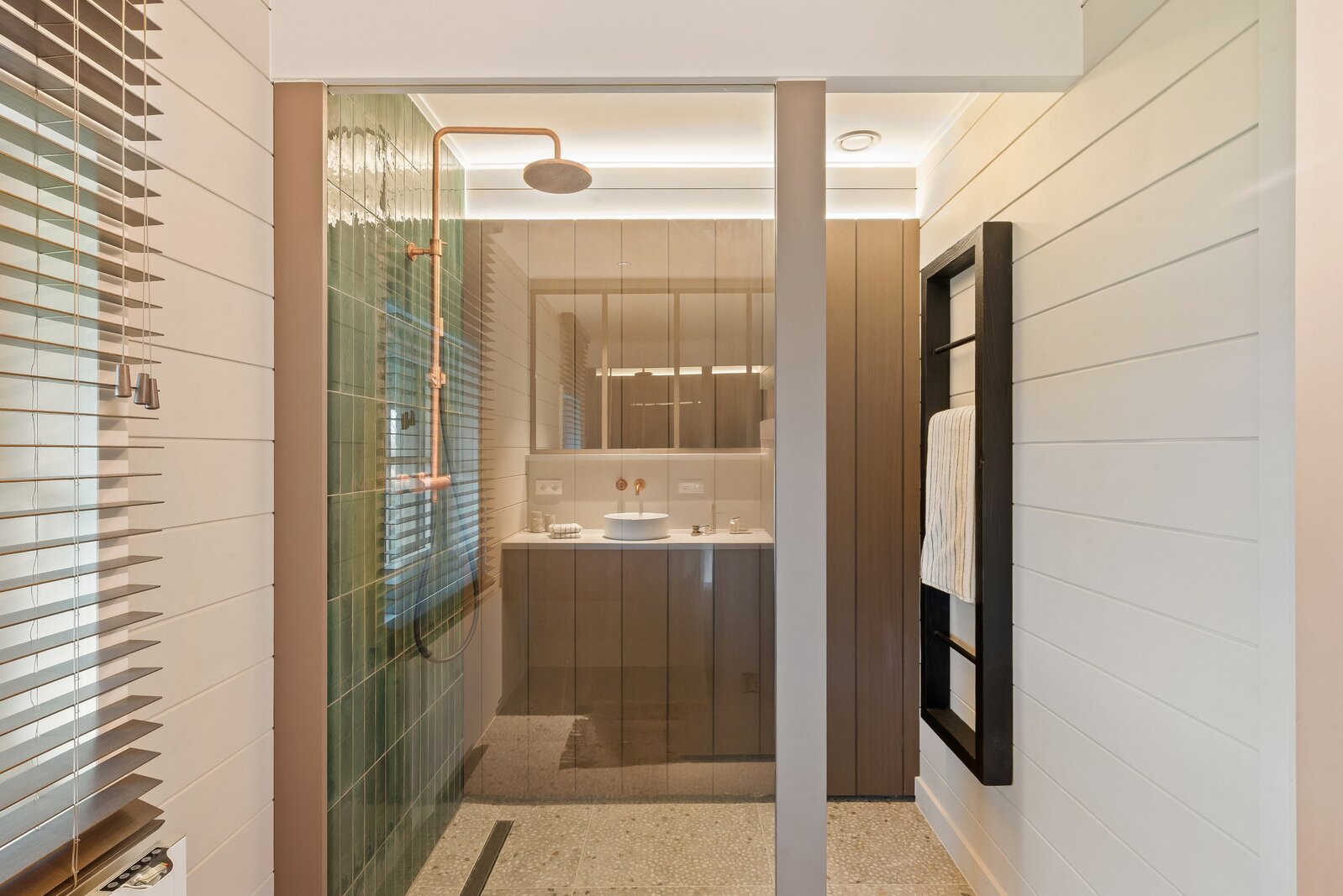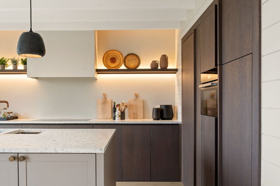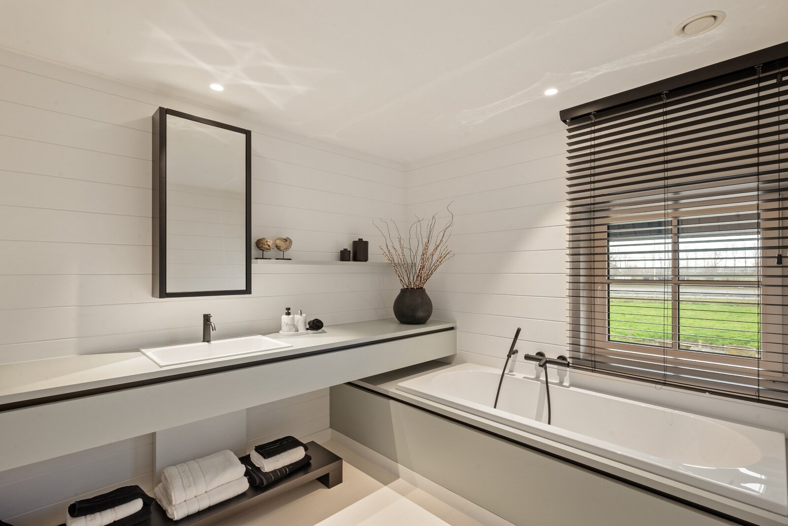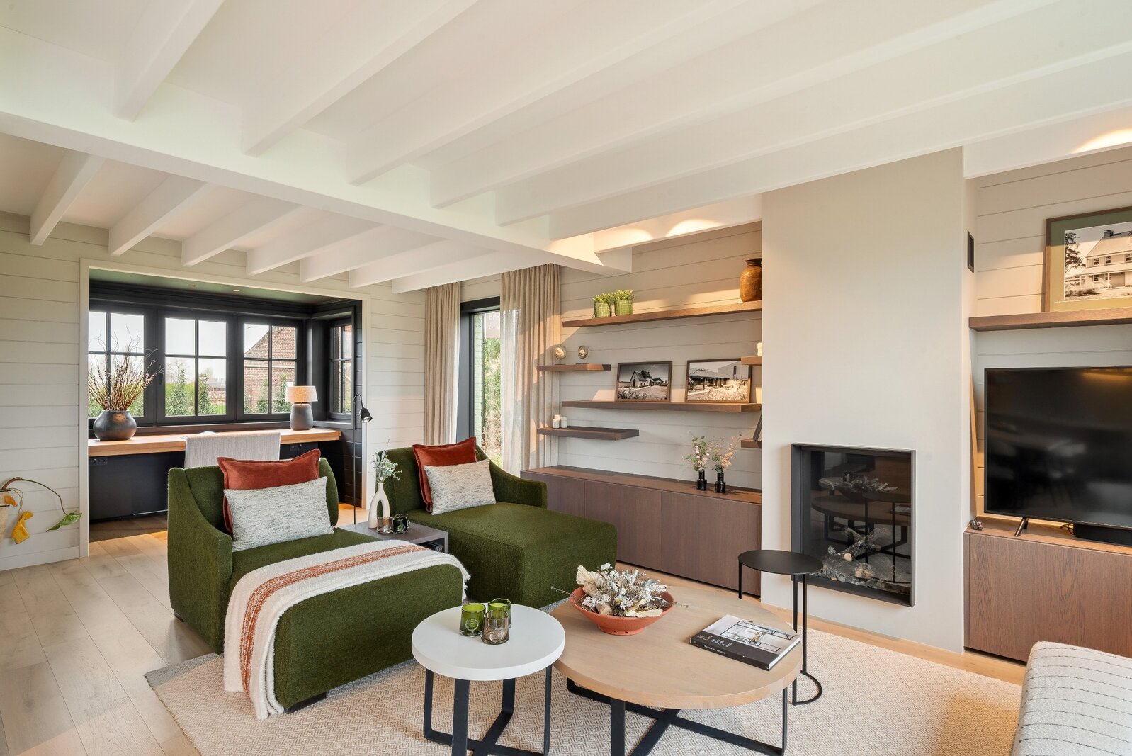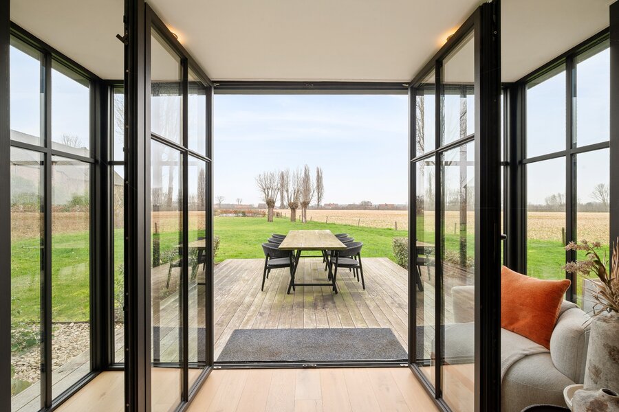 Bij binnenkomst verwelkomt de ruime inkomhal met gastentoilet u en zet meteen de toon voor de rest van het huis. De open leefkeuken met kwaliteitsvolle toestellen vormt het hart van de woning en sluit naadloos aan op de eetplaats en leefruimtes. Dankzij de grote raampartijen, volledig georiënteerd op de tuin, vloeien binnen- en buitenleven harmonieus in elkaar over. De leefruimtes zijn voorzien van vloerverwarming voor optimaal comfort. Aansluitend bevindt zich een praktische wasplaats met extra bergruimte en buitendeur.