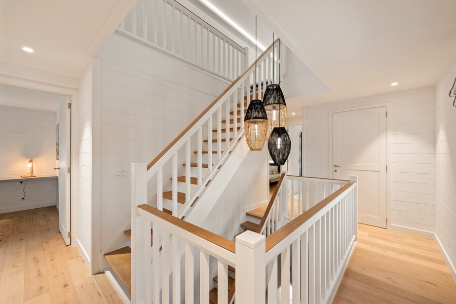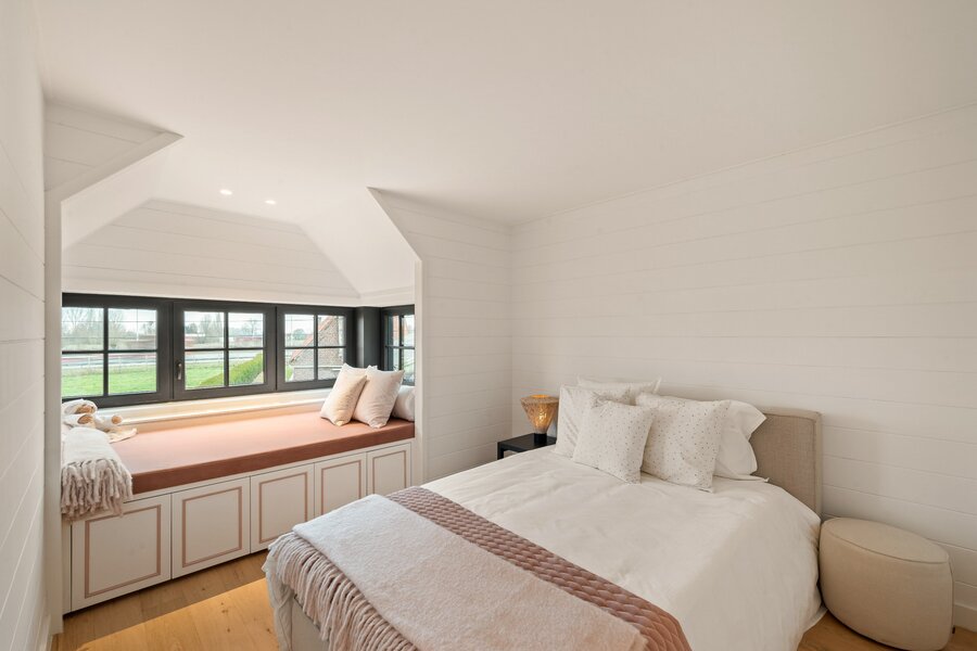 Op de eerste verdieping vindt u drie volwaardige slaapkamers en twee badkamers. De master bedroom biedt luxe met een eigen dressing en ensuite badkamer. De twee overige slaapkamers delen een tweede, ruime badkamer met ligbad.
