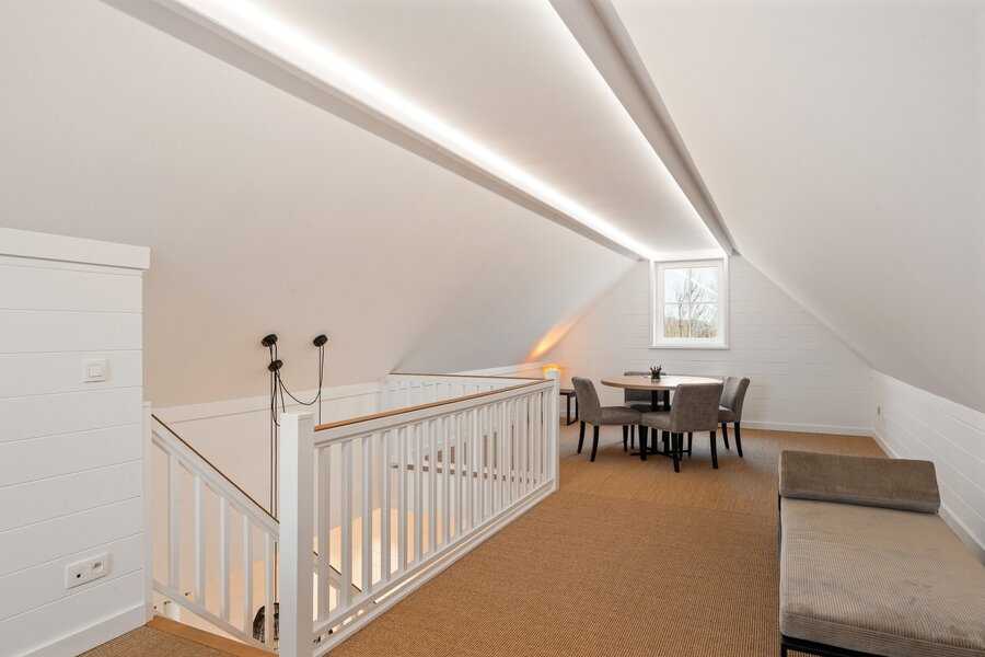 De hoger gelegen verdieping herbergt een riante, multifunctionele ruimte die kan dienen als extra slaapkamer, kantoor of hobbyruimte.