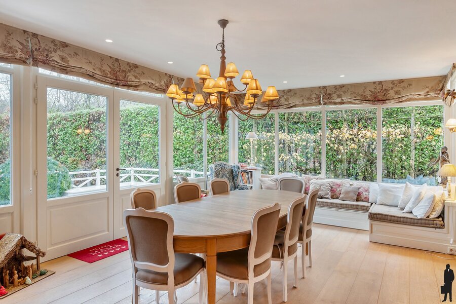 - Eetgedeelte met ingemaakte lounge. Door de raampartijen, prachtig zicht op de tuin en achterliggende bossen.