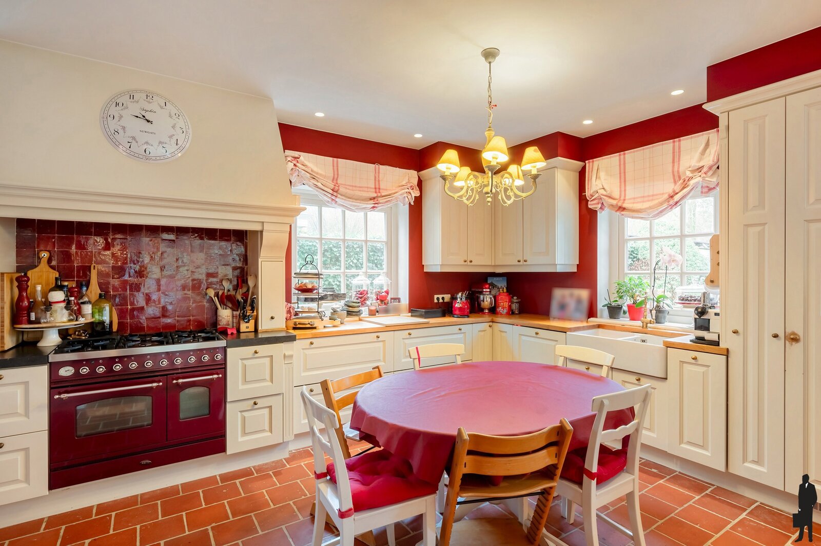 Massief houtenaanrechtblad met dubbele gootsteen én Borreti gasfornuis met 6 pitten en 2 aparte ovens, vaatwasser (Mielle), koelkast (Bosch). Zij-ingang via de keuken.