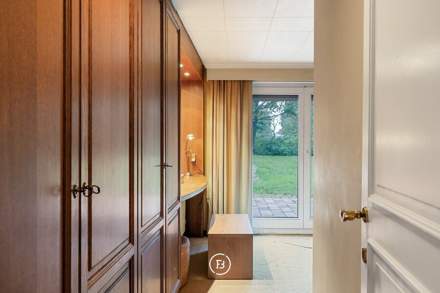 Op het gelijkvloers vindt u een ruime, lichtrijke leefruimte met prachtig uitzicht op de tuin. De gezellige eetkamer met haardvuur sluit naadloos aan op de volledig uitgeruste keuken en praktische berging. Verder is er een badkamer met toilet, én een ruime slaapkamer met en-suite badkamer en dressing – ideaal als master suite op het gelijkvloers.