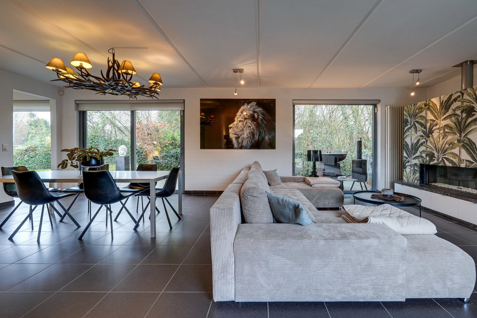 The bright living room is enhanced by an open gas fireplace, creating a cosy and inviting ambiance. The adjoining semi-open kitchen forms the heart of the home, ideal for cooking and spending time together. The ground floor also includes a home office, a practical laundry room and two separate toilets.