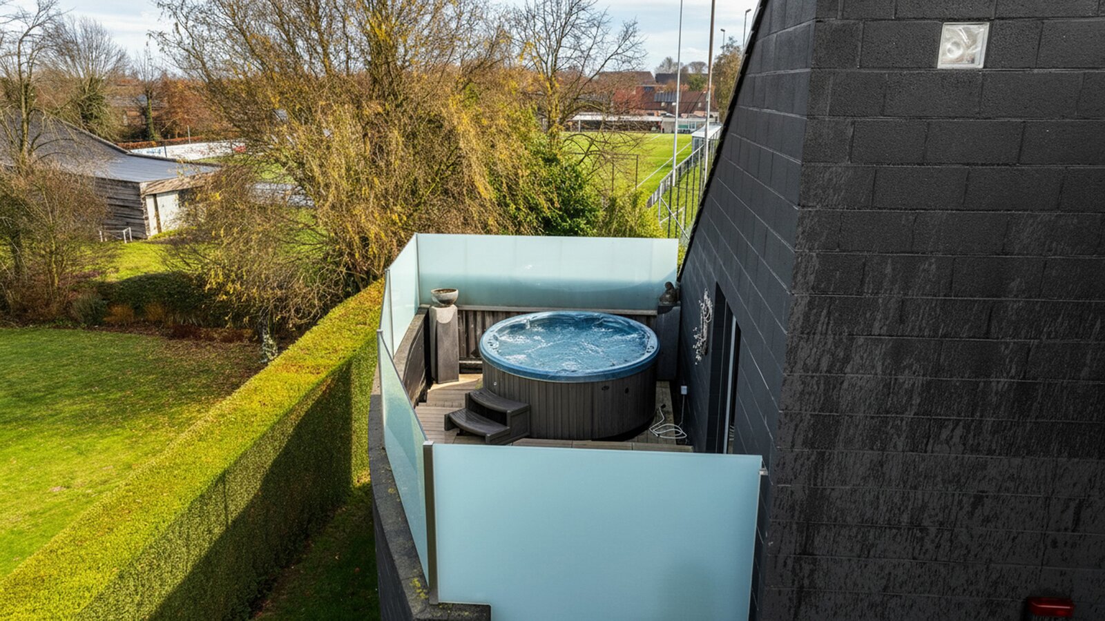 On the first floor, there are three full-sized bedrooms. One bedroom features a private terrace with jacuzzi, offering a true at-home wellness experience. A dressing room and a bathroom with both bath and shower complete this level.
