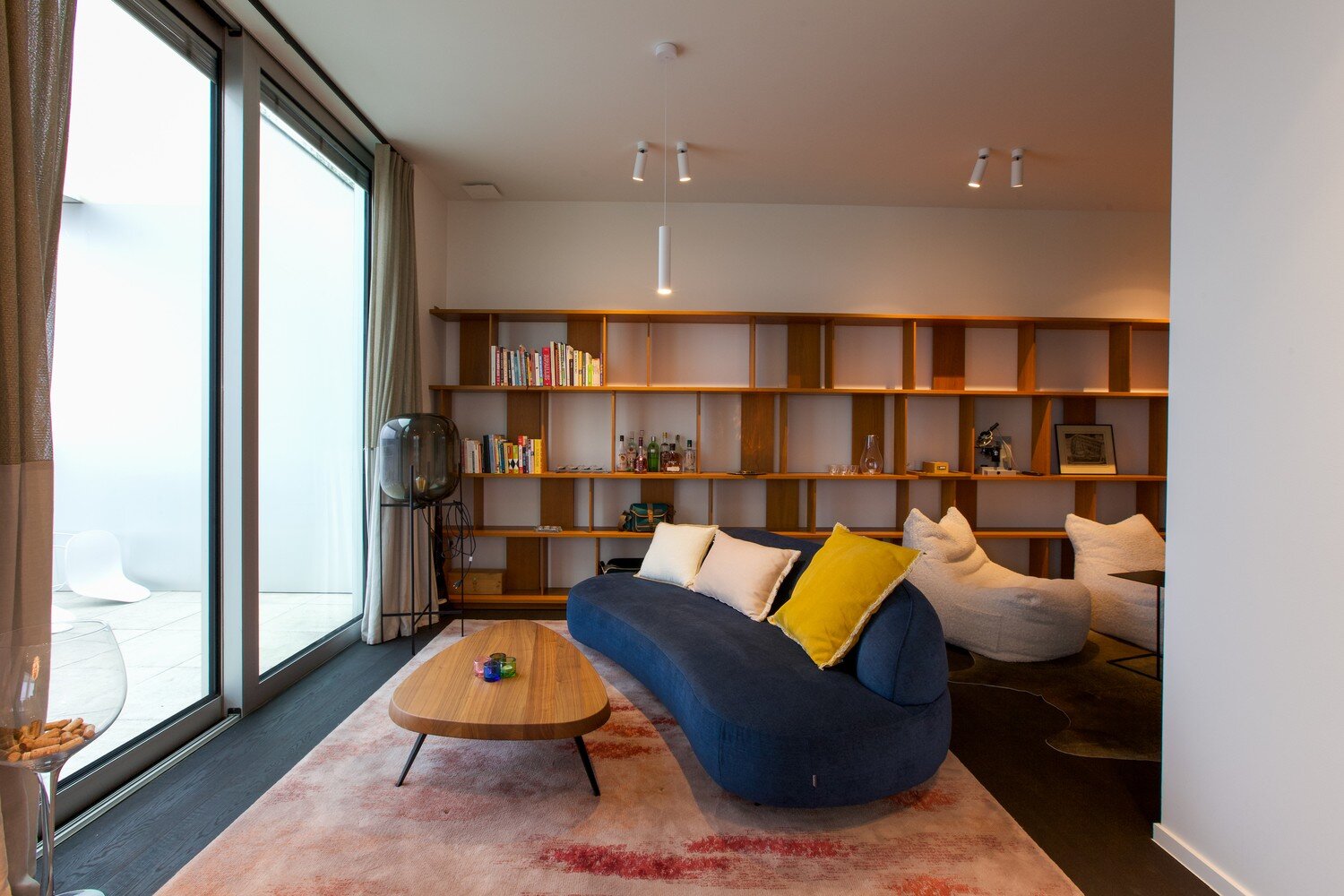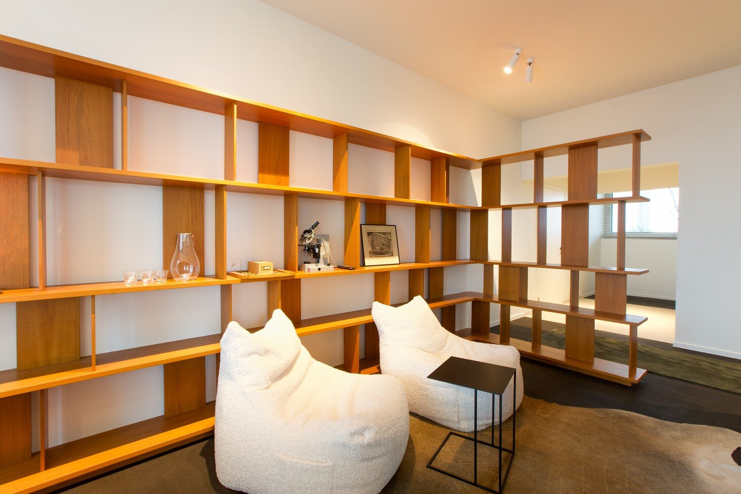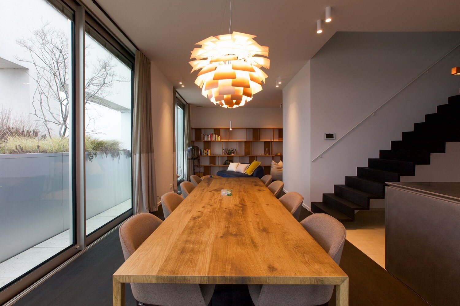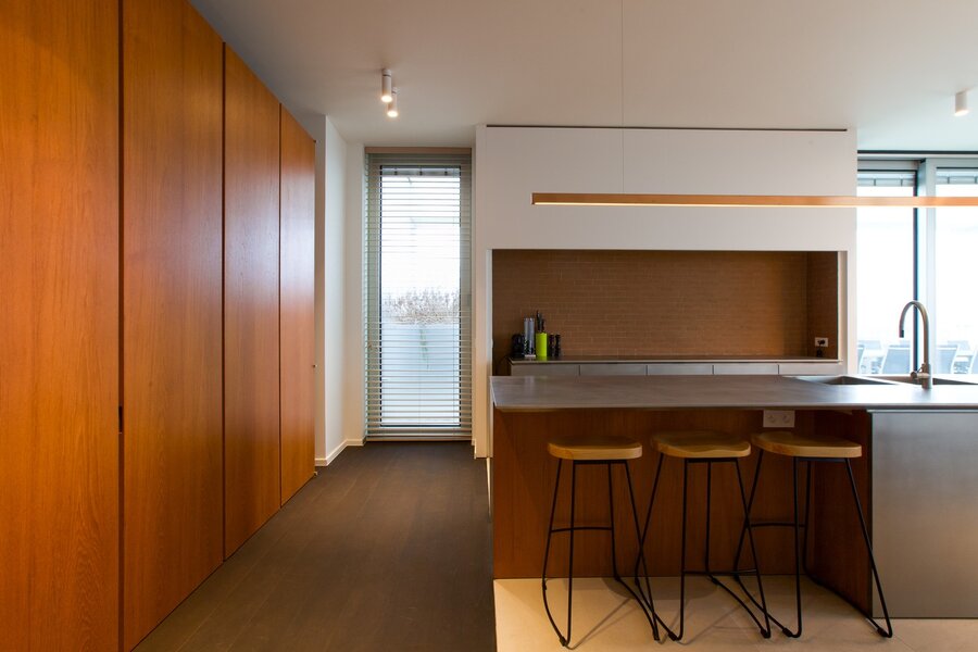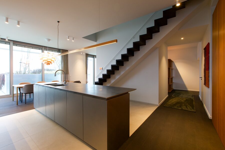 De riante leefruimte met open keuken vormt het hart van de woning. De keuken is uitgerust met een elegant inox kookeiland, hoogwaardige Miele toestellen, verfijnd ingewerkt in maatwerk met massief teak – perfect voor wie houdt van stijl en functionaliteit. Vanuit de eetkamer stapt u rechtstreeks op het ruime zonneterras, omringd door groen en rust. De woonkamer straalt warmte en karakter uit dankzij de op maat gemaakte massief houten boekenkast en hoge plafonds.