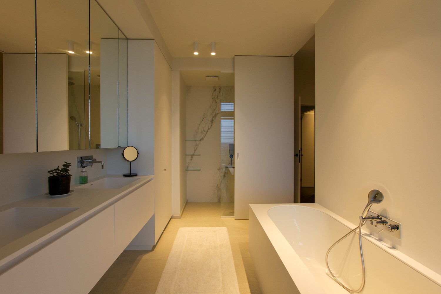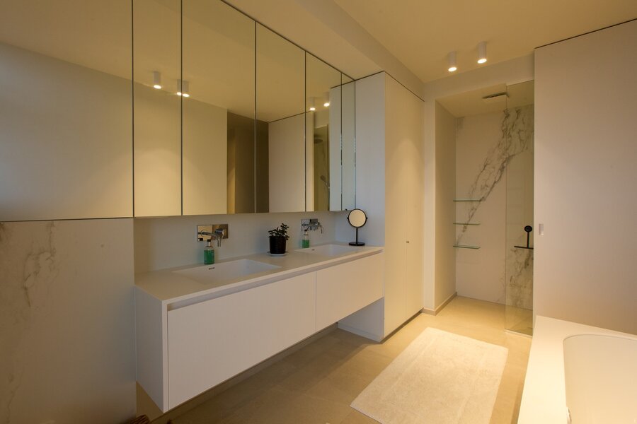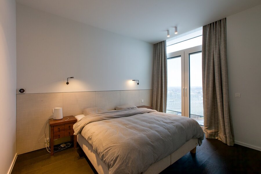 De hoofdslaapkamer aan de rustige zijde van het penthouse beschikt over een ruime inloopdressing en een luxueuze badkamer met inloopdouche en bad. Daarnaast zijn er twee extra slaapkamers met een aparte badkamer, voorzien van een moderne douche. U heeft er ook een technische ruimte/ruime berging voor wasmachine/droogkas.
