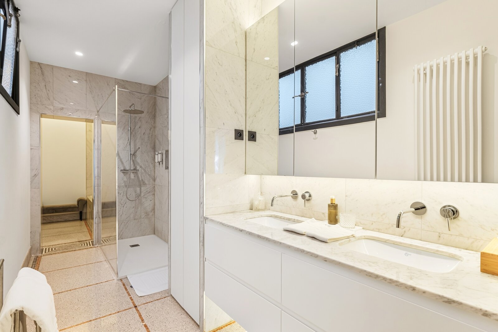 High-end features include a rooftop with bar and open views, multiple terraces, gas heating, double-flow ventilation, excellent insulation, noble materials (wood, marble, original terrazzo), skylights, full basement, water softener, and outdoor parking.