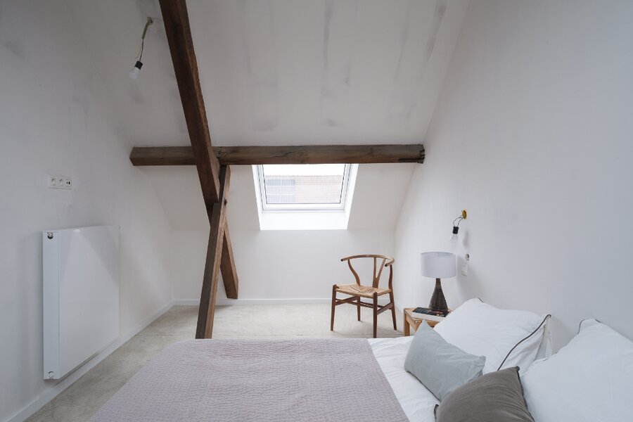 Dit doorzonappartement combineert hedendaags comfort met een rustieke uitstraling dankzij de behouden authentieke balken.