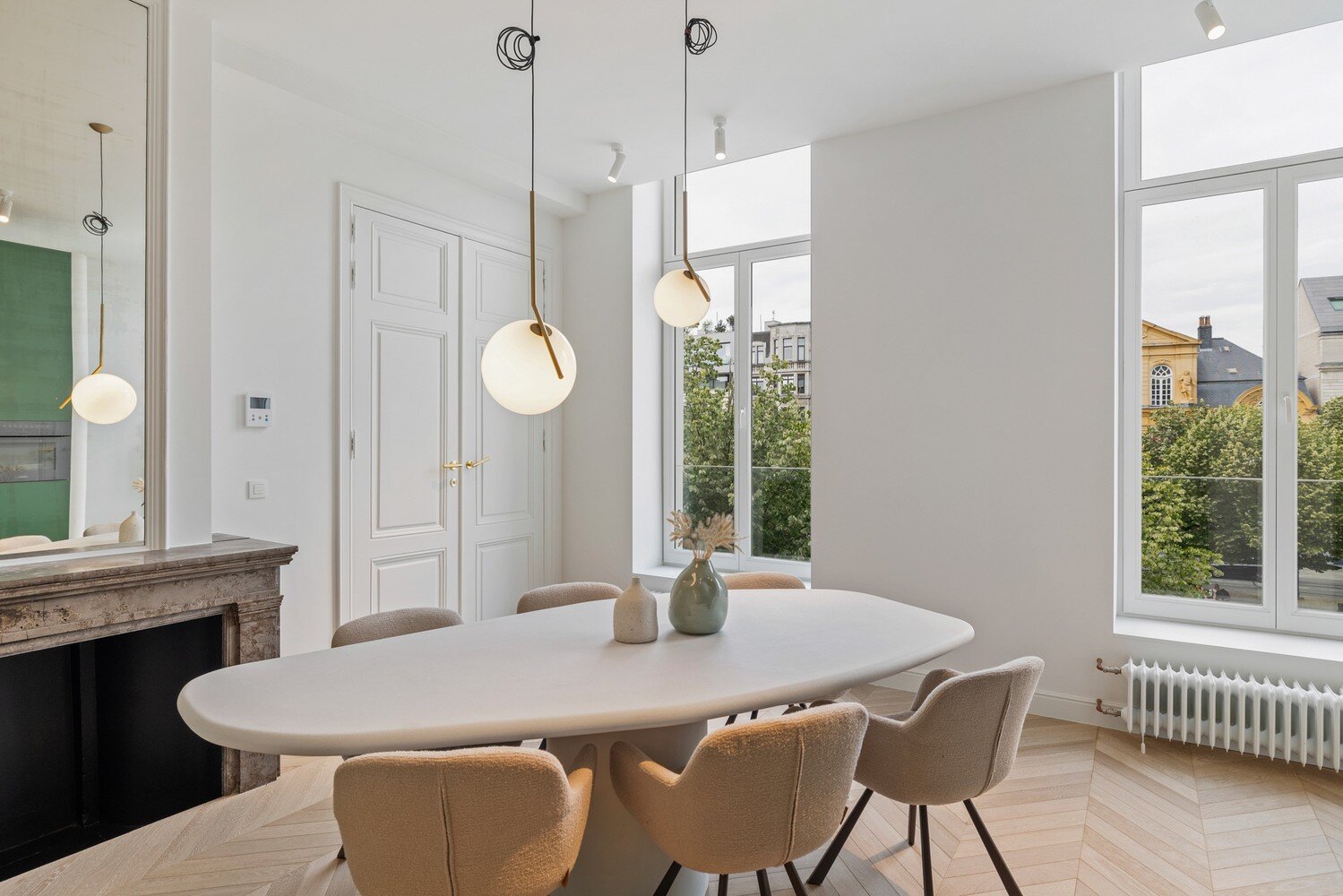 Geniet van indrukwekkende architecturale details zoals sierlijsten, hoge plafonds en elegante wandpanelen, een waar genot voor het oog. Het appartement is praktisch en doordacht ingedeeld, met een prachtige entree via dubbele, decoratieve deuren die leiden naar een royale leefruimte. Hier vindt u een stijlvol Hongaarse punt parket, een moderne vestiaire en grote raampartijen met adembenemend zicht op de Kouter.