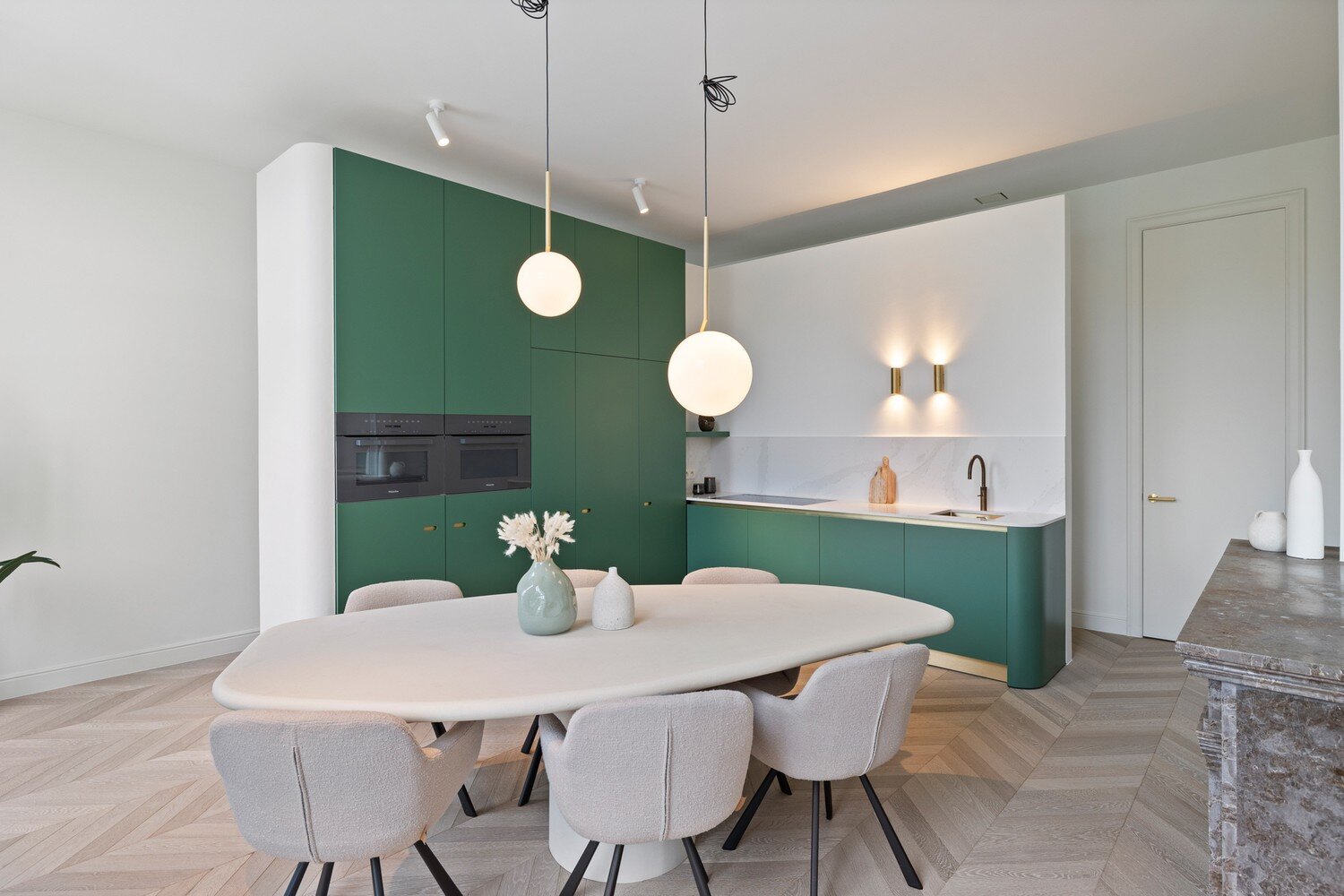 Via een tweede set prachtig versierde deuren komt u in de moderne, groene keuken, volledig uitgerust met alle hedendaagse toestellen. Achteraan bevinden zich twee comfortabele slaapkamers met ingebouwde kasten, waarvan de tweede kamer beschikt over een eigen badkamer met douche.