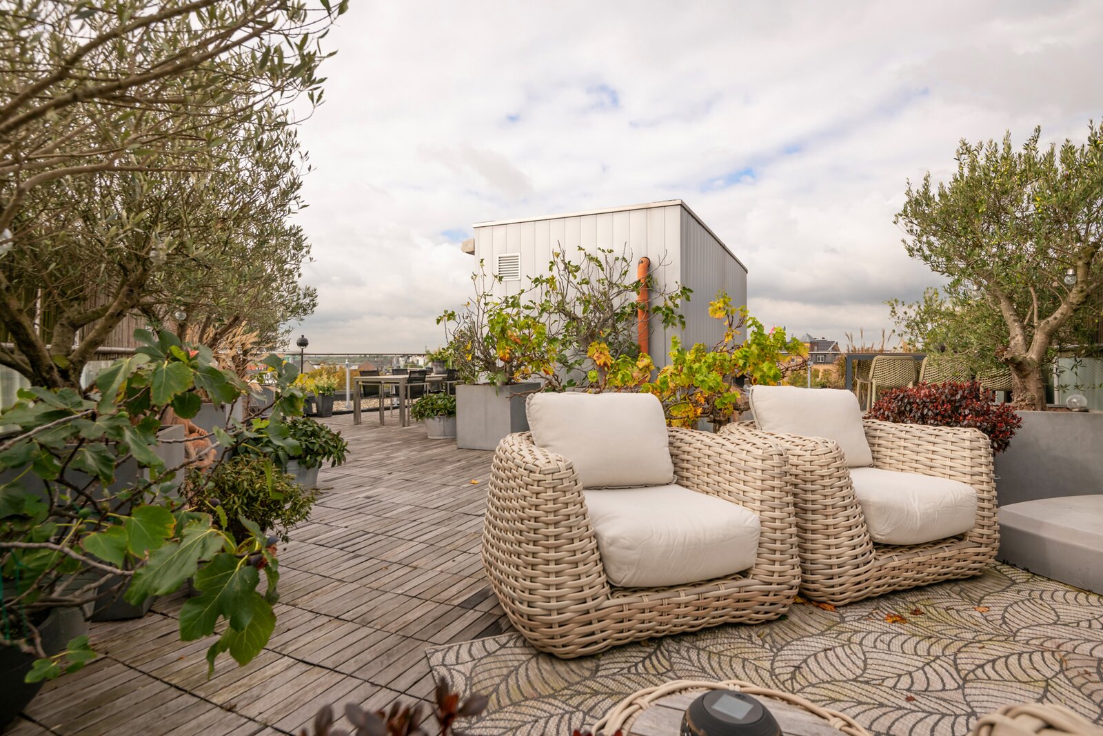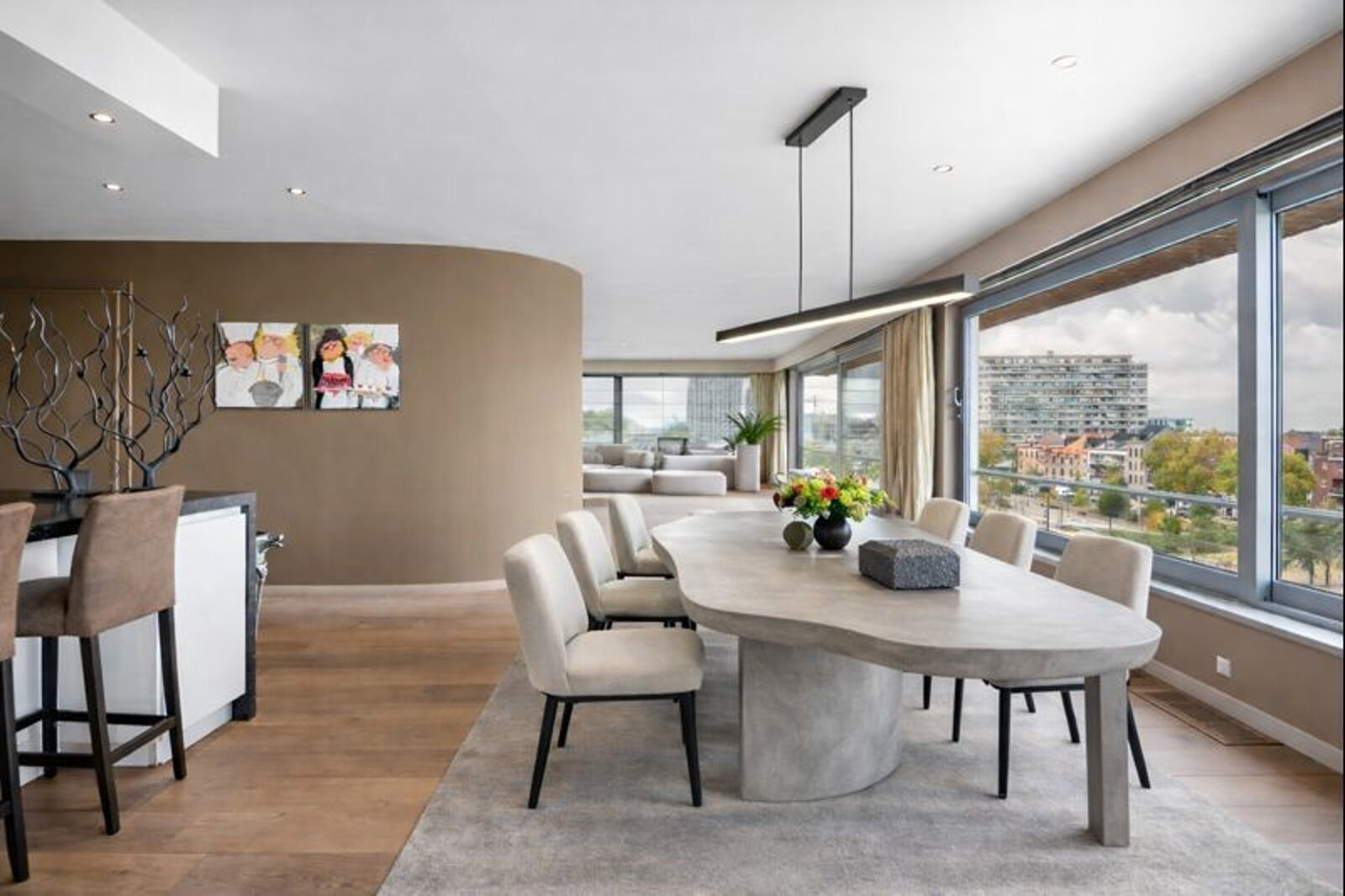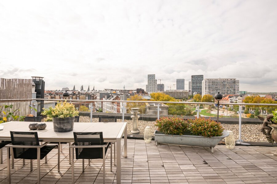 Welcome to a world where urban elegance and natural tranquility meet. This unique penthouse at Zuidpark is truly one of a kind, a place where every detail has been thoughtfully considered, and where the refinement inside seamlessly flows into the breathtaking view outside. The current owner, also the first resident since 2006, has decorated this living gem with an eye for quality and timeless class. Every element, from the solid oak floors to the custom-made kitchen with high-quality appliances. The living space exudes a special tranquility thanks to the abundant light and the frontal view of the park and the iconic 'Waterpoort'. The gas fireplace, strategically placed between the living area and the separate sitting area, forms the warm heart of the apartment. The home is fully equipped with home automation, allowing you to control both lighting and window blinds with a single touch. Comfort, efficiency, and atmosphere in perfect harmony. The master bedroom offers a private retreat in itself, with a luxurious bathroom, spacious walk-in dressing room, and an elegant office. The second bedroom with ensuite shower room completes this penthouse, ideal as a quiet guest space. And then there is the crown jewel: the private rooftop garden, where you overlook the Antwerp skyline, with a view of the 'Zuidpark'. The stylish furniture of the rooftop garden is included in the price, so you can immediately enjoy this oasis of peace and exclusivity. Additional assets: Double cascade parking space available at €80,000. Two spacious storage rooms are included in the price. Unique in its kind. Perfectly maintained. Move-in ready.