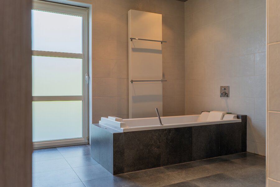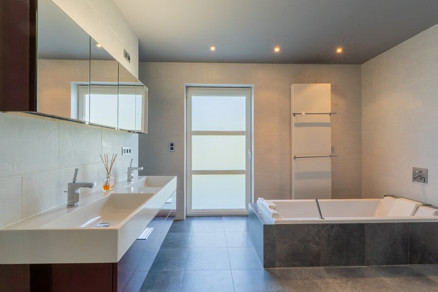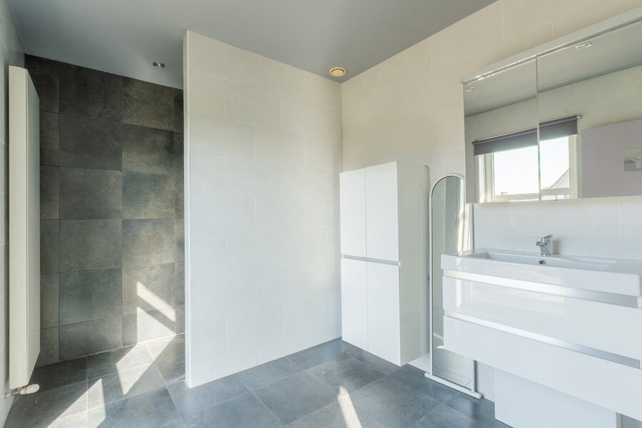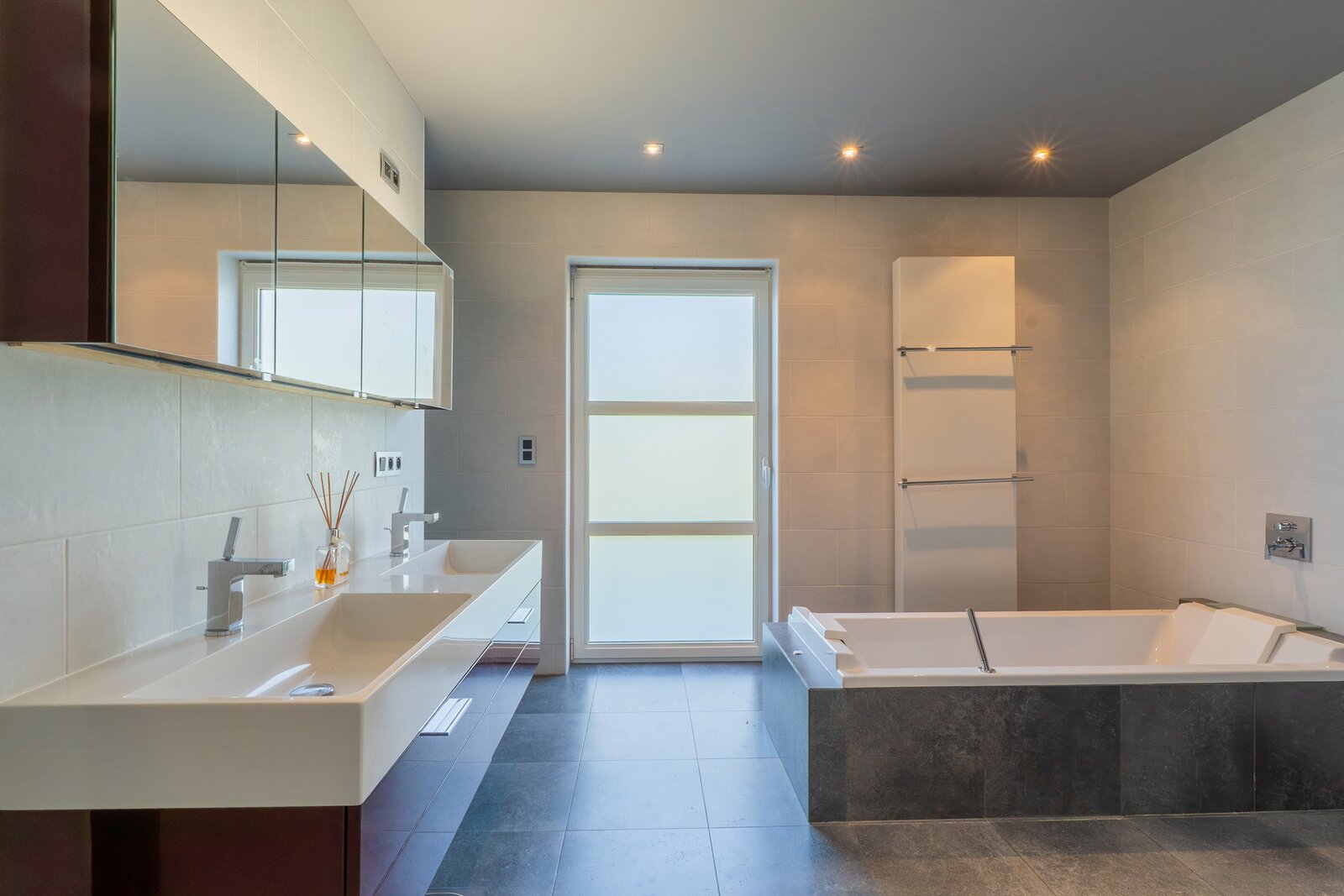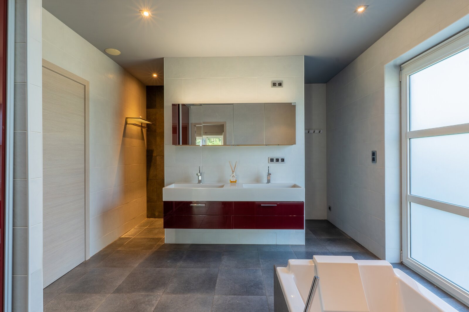 The left wing has the night area with a master bedroom and a bathroom with walk-in shower, bathtub, double sink and toilet. The second bedroom also has its own bathroom with walk-in shower and sink.