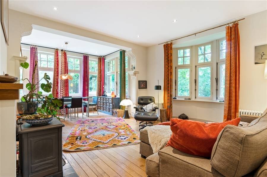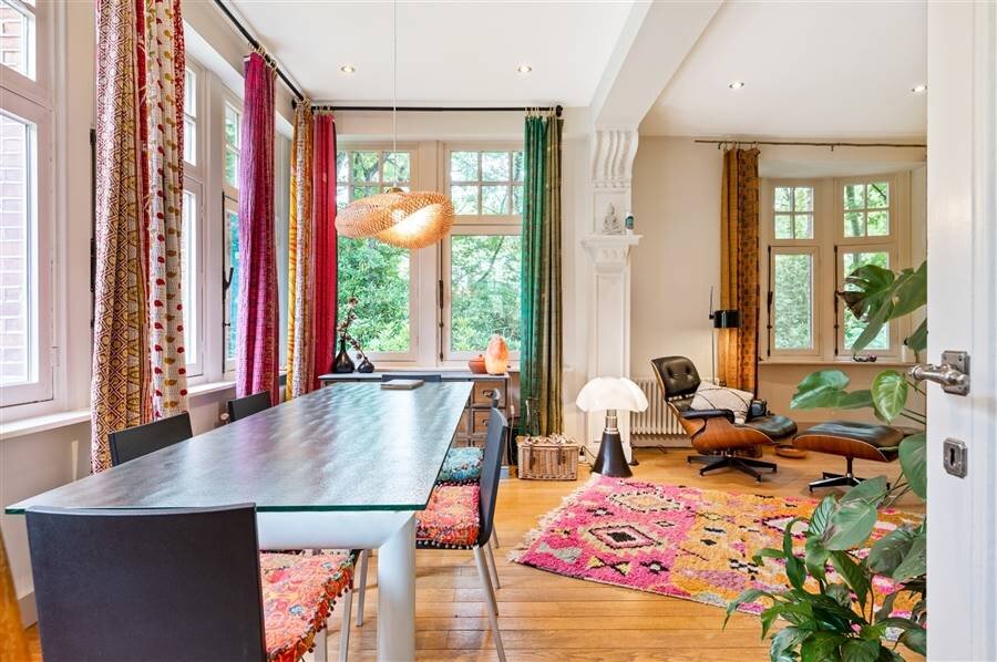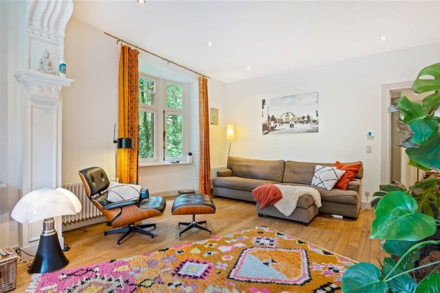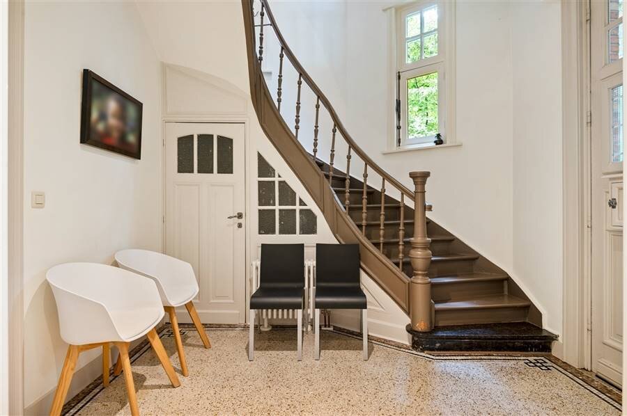 You enter the house through the entrance hall with stairs to the first floor and guest toilet. From this central entrance hall you reach the various living spaces, with an office or study at the front of the house. Spacious living room with fireplace and adjacent dining room with several windows overlooking the garden. From the dining room as well as from the entrance hall you have access to the spacious kitchen with breakfast room or dining area. From the kitchen access to the garden and terrace.