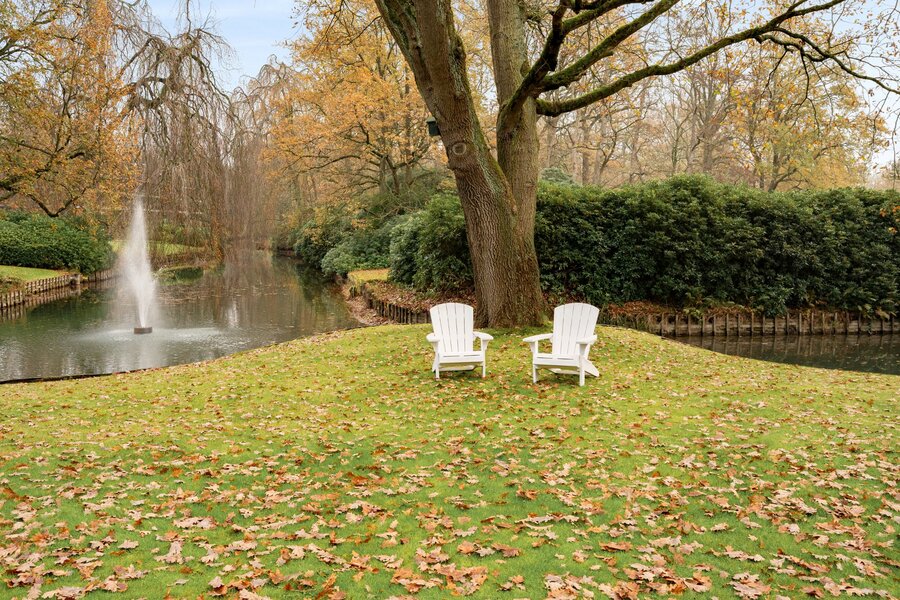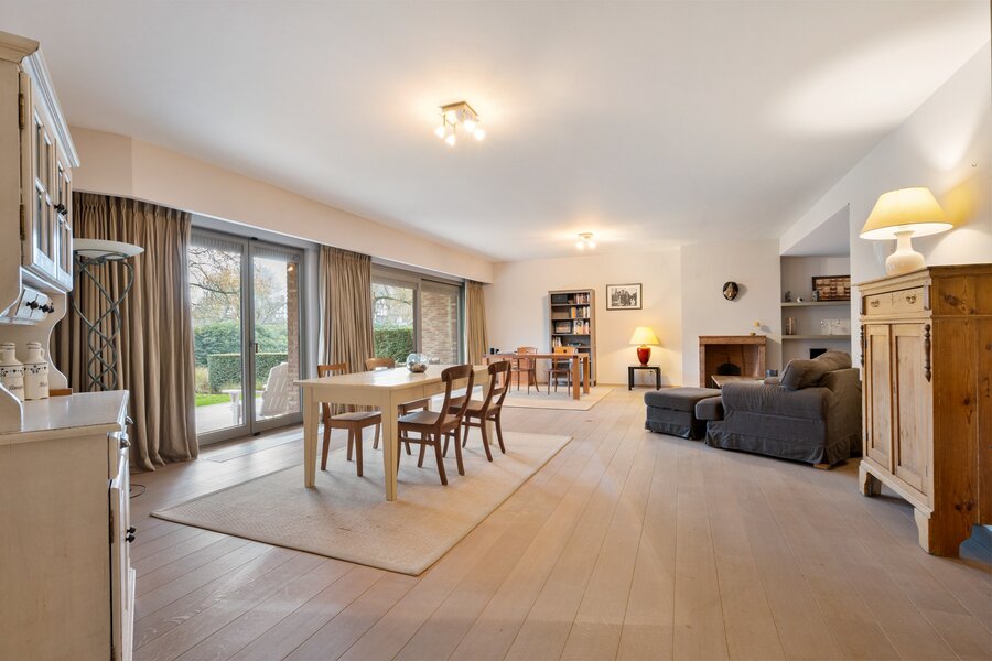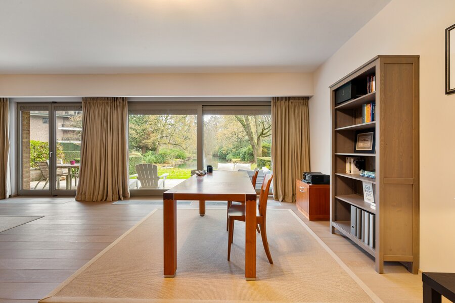 De zeer ruime woonkamer, afgewerkt met eiken parket, omvat een eethoek, gezellige tv-hoek en leesruimte. Grote raampartijen zorgen voor een mooie lichtinval en directe toegang tot het ruime en zonnige terras met zicht op de fraai aangelegde tuin en vijver.