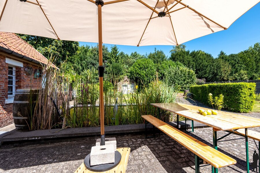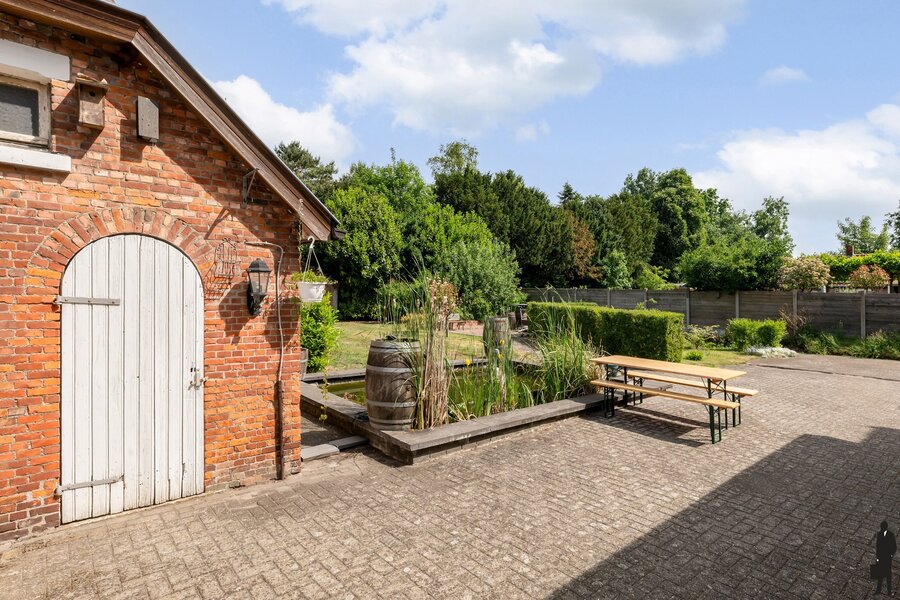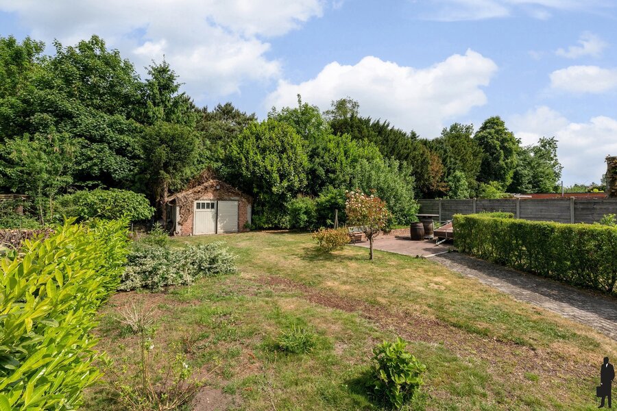 De woning heeft een oprit met poort aan de zijkant van de woning. Er is voldoende parking voor wagens. Achteraan in de tuin bevinden zich een drietal (stenen) bergruimten/tuinhuizen waarin allerlei (tuin)gereedschap kan worden opgeslaan. Het ruime terras geeft uit op de diepe, landelijke en private tuin. U vindt er verschillende kruidenperken, jonge heesters en bomen, plaats voor moestuin, alsook een sfeervolle vijverpartij met vis. De voor- (en achter)tuin kan naar believen worden aangelegd.