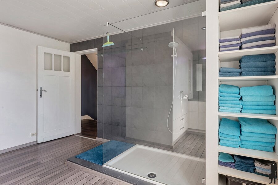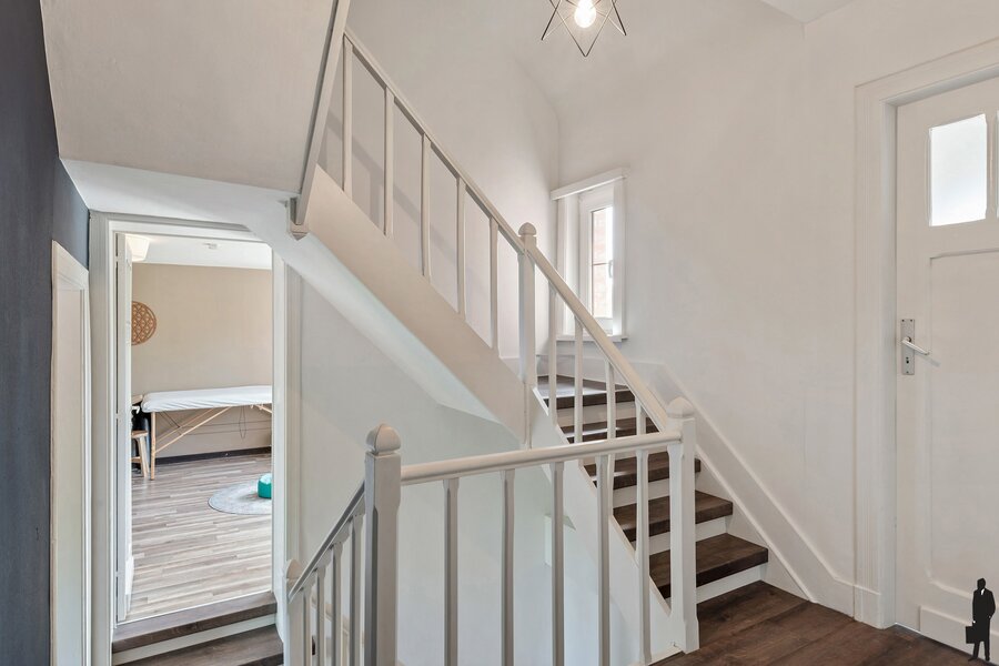 De authentieke, houten bordestrap in de inkomhal brengt u naar de eerste verdieping. Hier bevinden zich 4 ruime slaapkamers met veel lichtinval en tevens de hoofdbadkamer met inloopdouche, twee afzonderlijke wastafels en voldoende kastruimte. Er is een wasplaats voorzien. Eén van de vier slaapkamers wordt thans benut als massage- en therapieruimte. Een andere kamer doet dienst als B&B-kamer 2. Laatstgenoemde kamers hebben beiden toegang tot een afzonderlijke badkamer met inloopdouche, wastafel en toilet.
