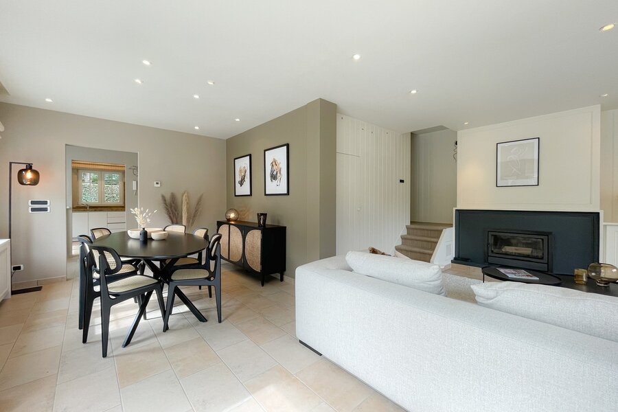 Composition: Hall d'entrée avec toilettes invités. Agréable coin salon avec cheminée, suivi d'une salle à manger lumineuse. Les deux pièces s'ouvrent sur la terrasse et le jardin parfaitement orienté. Cuisine séparée avec coin petit-déjeuner confortable, équipée de tout le confort moderne. Buanderie. Les escaliers au 1er étage partent du salon.