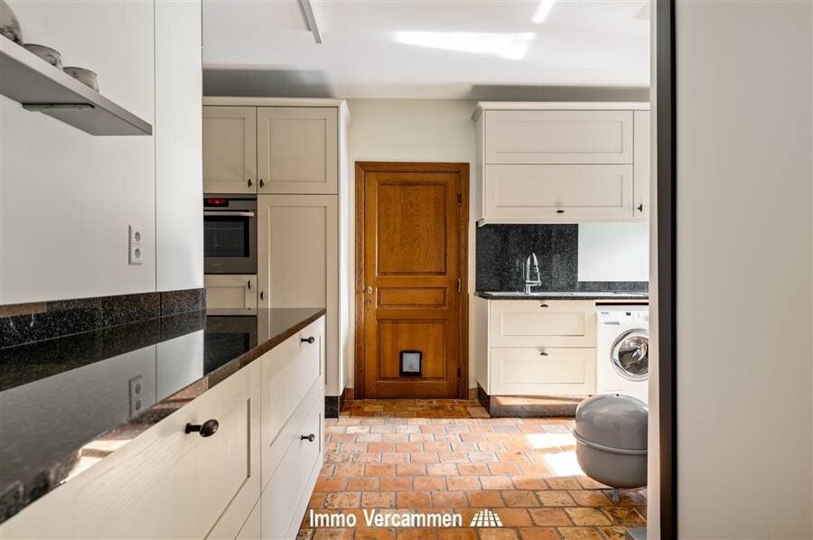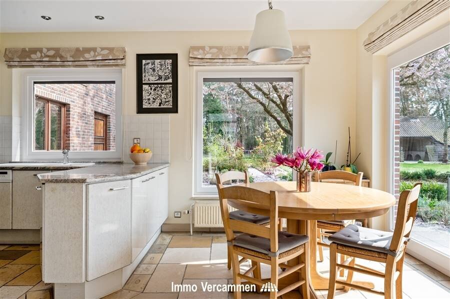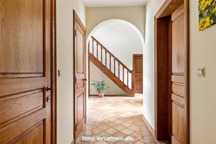 Through the impressive entrance hall with guest toilet you enter the house. Adjacent is a practical office space, ideal for home office. The spacious and bright living space offers a beautiful view of the garden and connects to the fully equipped kitchen with recent utility room. On the ground floor you will also find a bedroom with dressing room and en suite bathroom, as well as a double indoor garage.