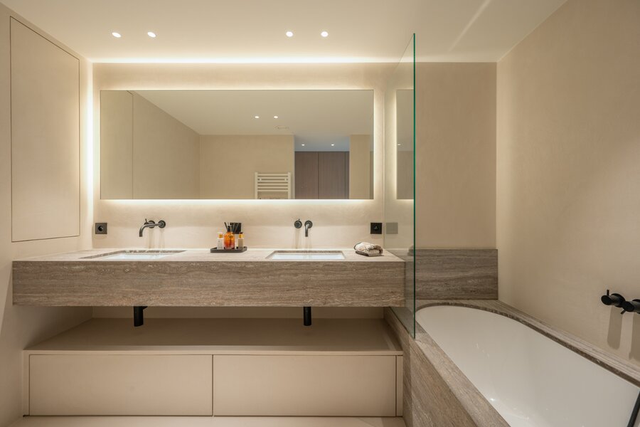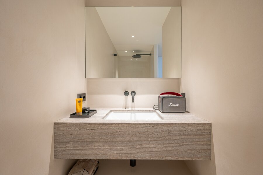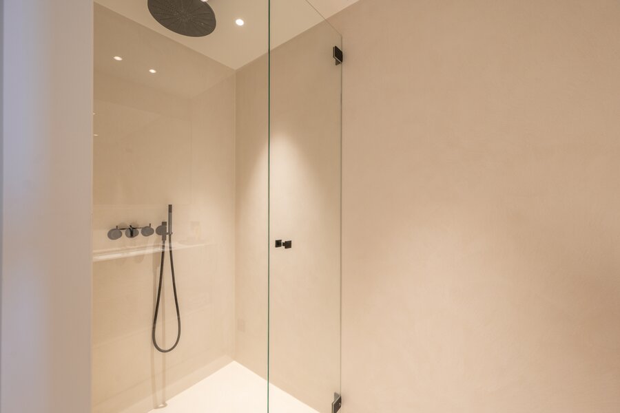 Entrance hall with guest toilet and storage room (equipped for a washing machine and dryer). Exceptionally wide living area opening onto the spacious terrace. Fully fitted open kitchen. Two full-sized bedrooms, each with its own bathroom and also with access to the terrace.