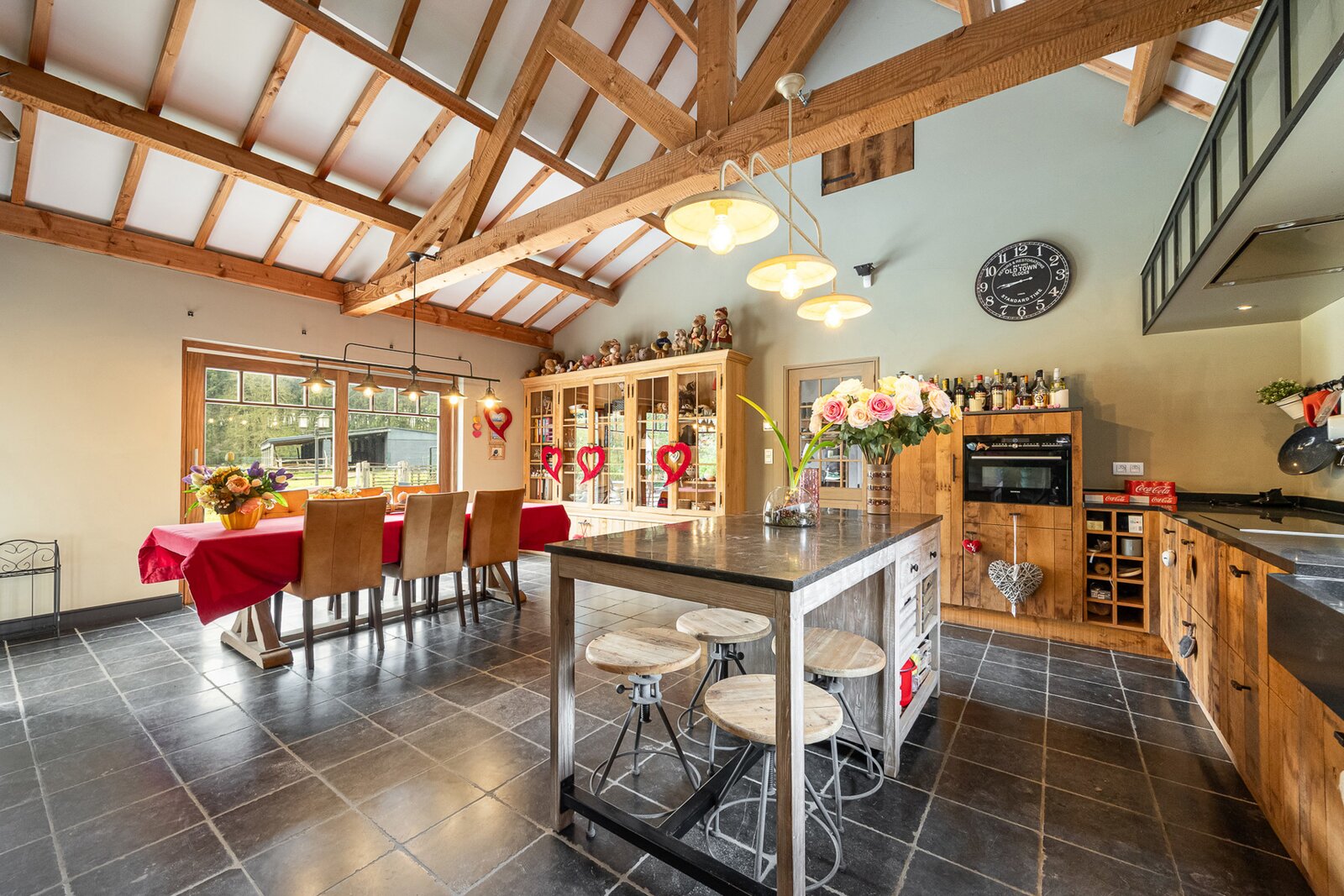 Keuken in eik 23m² op kerkdal, voorzien van inductiekookplaat, koelkast, vaatwasser, combi-oven, dampkap, dubbele spoelbak in arduin, kookeiland en ontbijthoek.