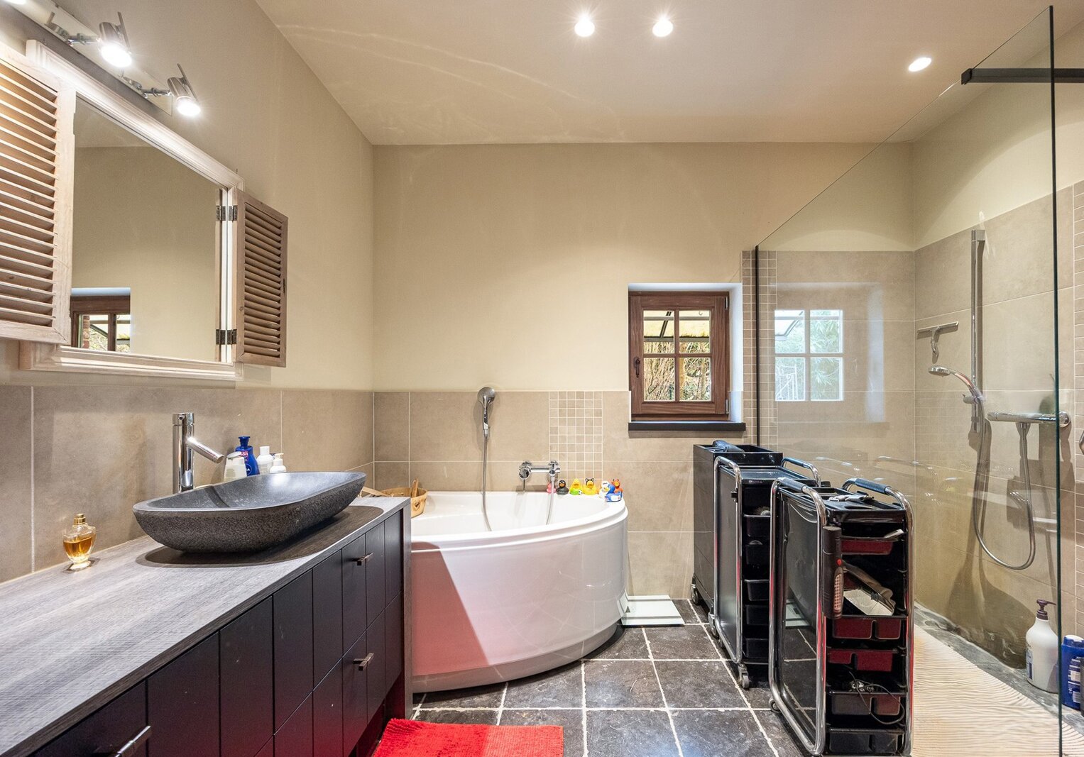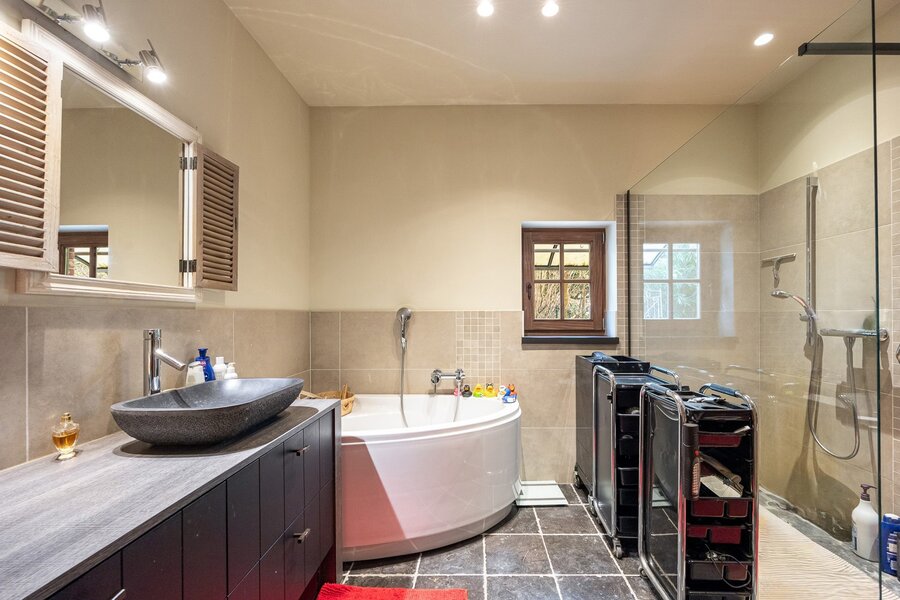Badkamer 8m² op met ligbad, inloopdouche en enkele lavabo.