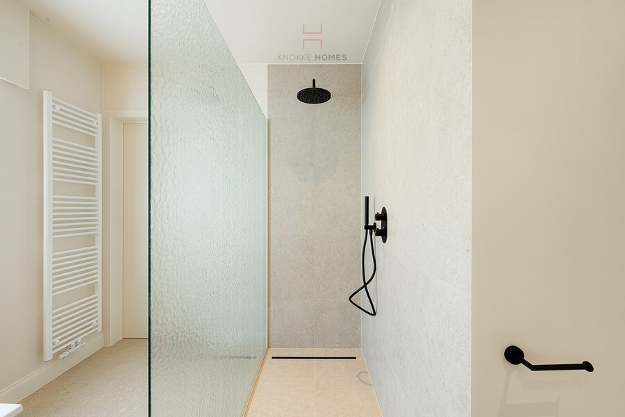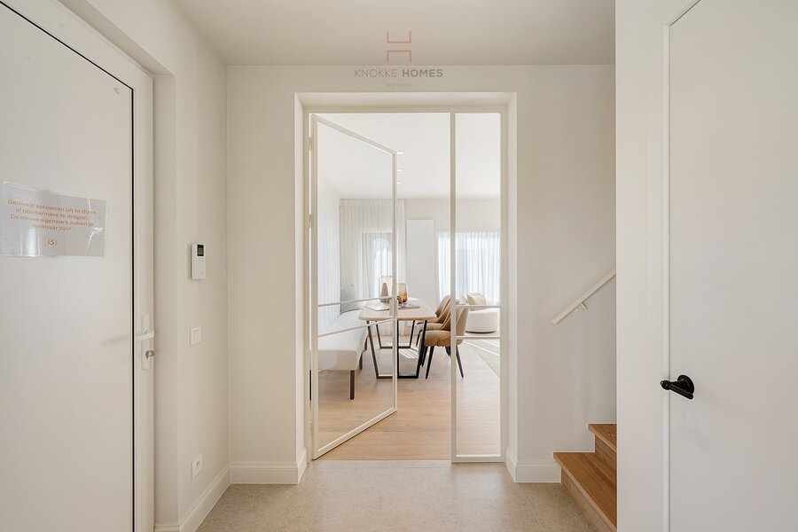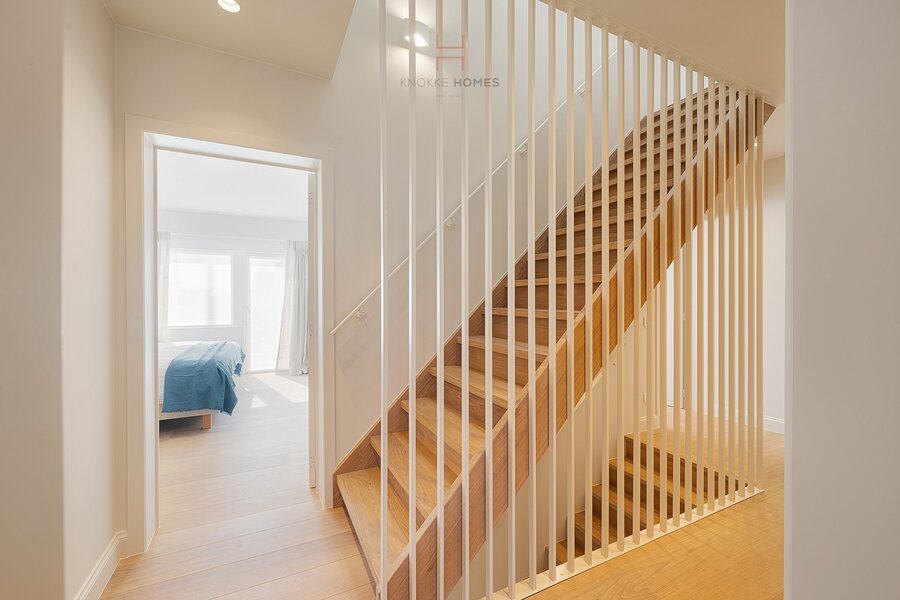 Upon entering through the stylish entrance hall with guest toilet, you are welcomed into the cosy and bright living area at the front and the open kitchen overlooking the garden. The sunny living room exudes warmth and elegance and forms the heart of the home, while the luxurious kitchen, finished in oak veneer, is a true eye-catcher. It is fully equipped with high-quality appliances and connects seamlessly to a charming dining area with beautiful views of the garden and terrace.