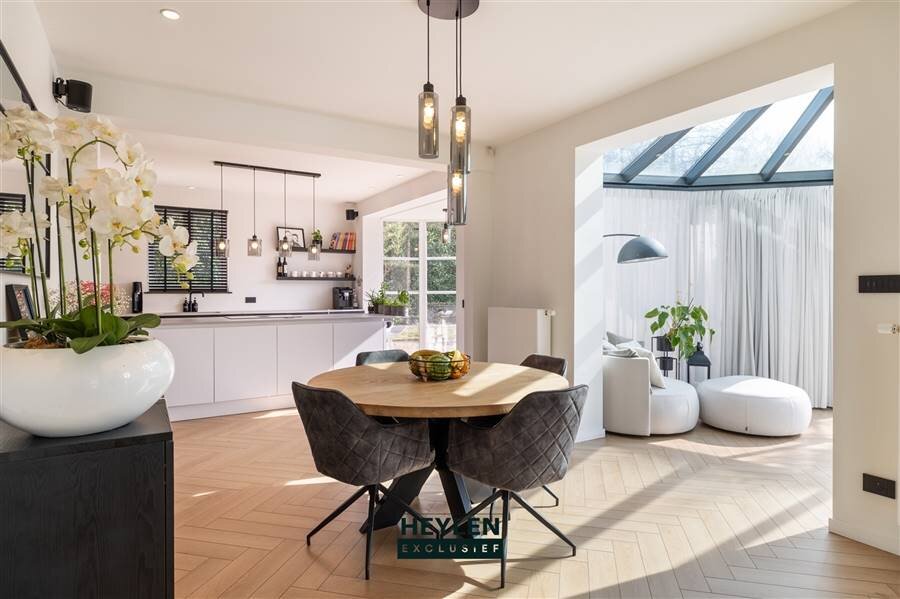 The expansive 74 m² living area forms the heart of the home, featuring a wood-burning fireplace (insert) that creates a warm and inviting atmosphere. Adjacent to the lounge is the kitchen, fully renovated in 2023 (22 m²) and equipped with high-end features including a wine cooler and a Quooker. A separate ground-floor office provides a quiet space for remote work, while the double indoor garage—topped by a 37 m² hobby room—offers endless possibilities for a home gym or leisure space.