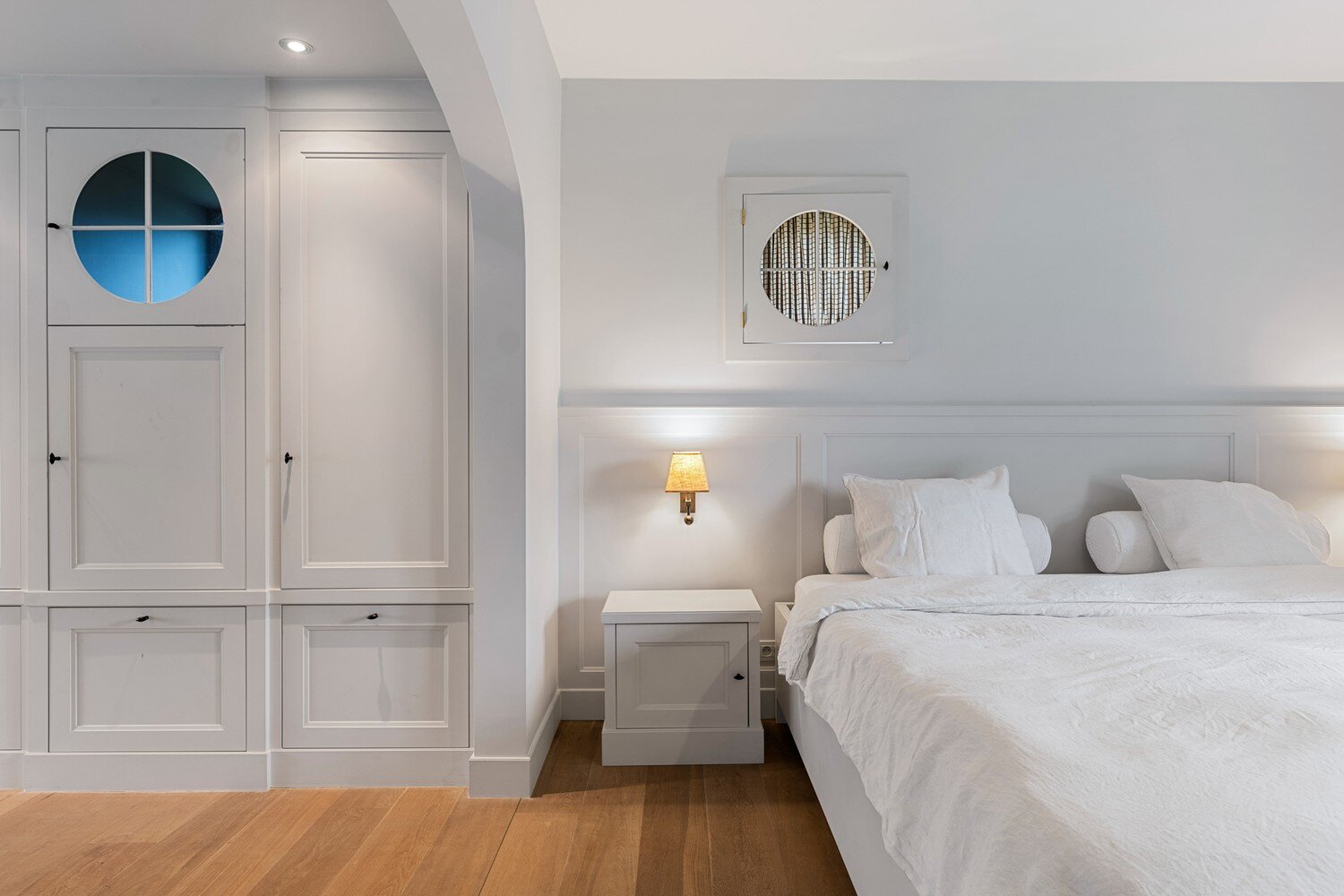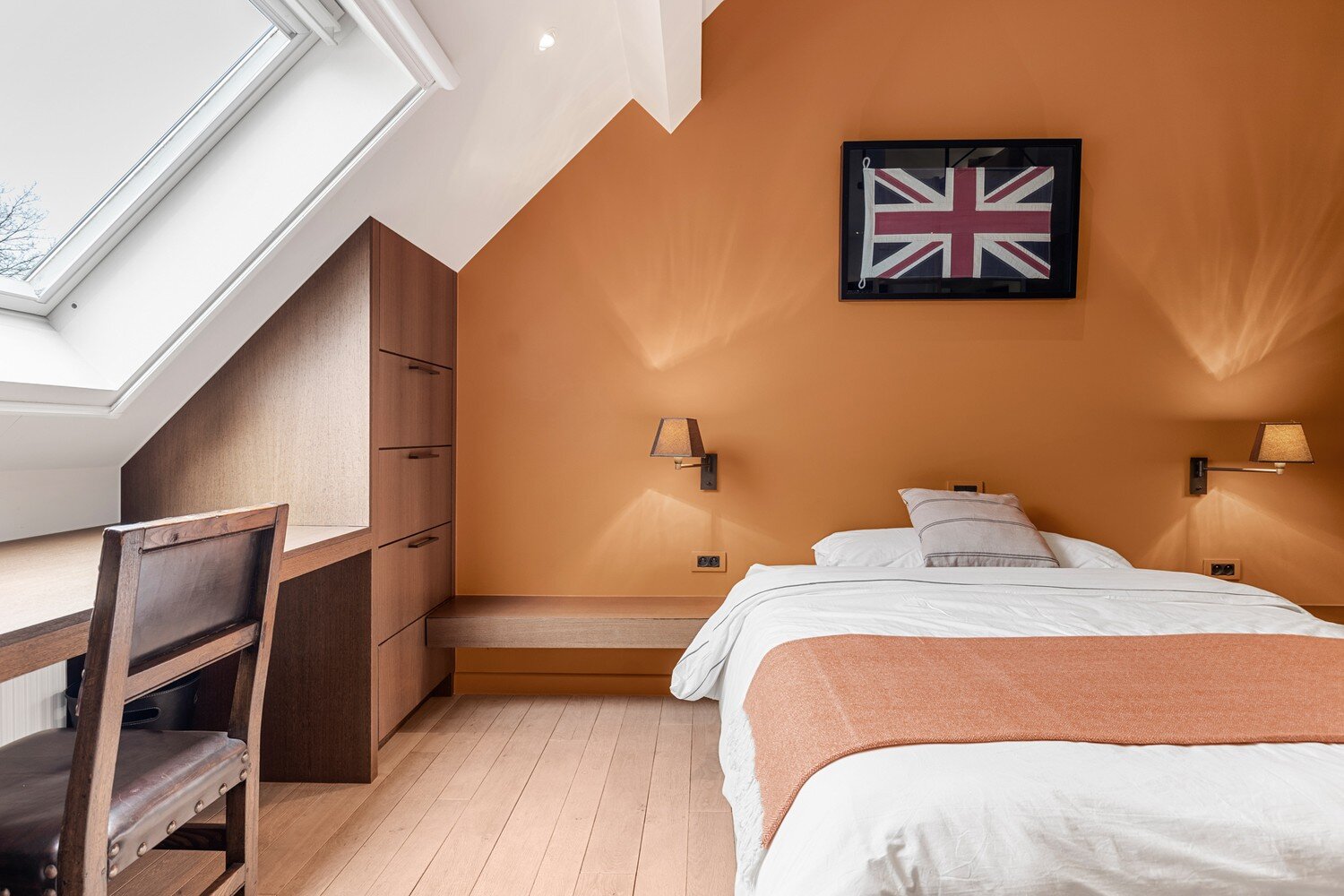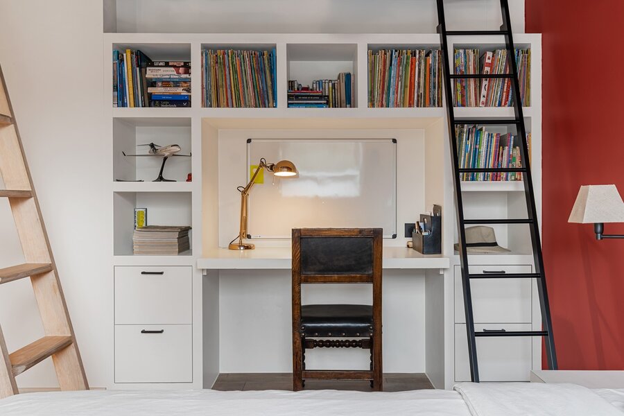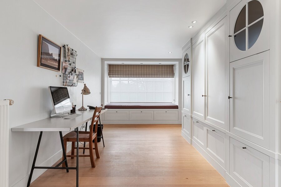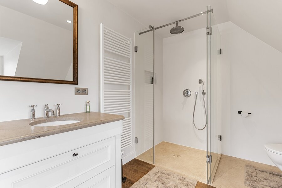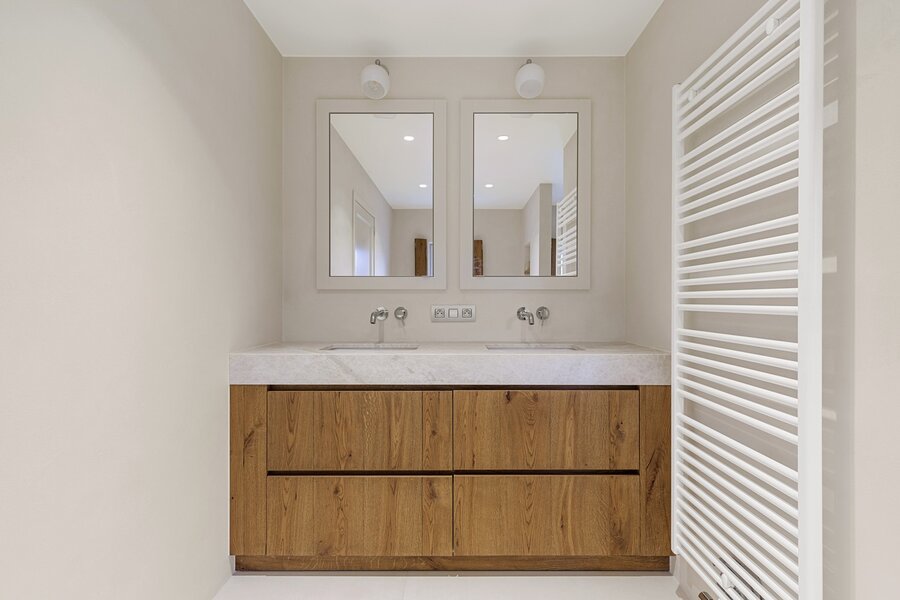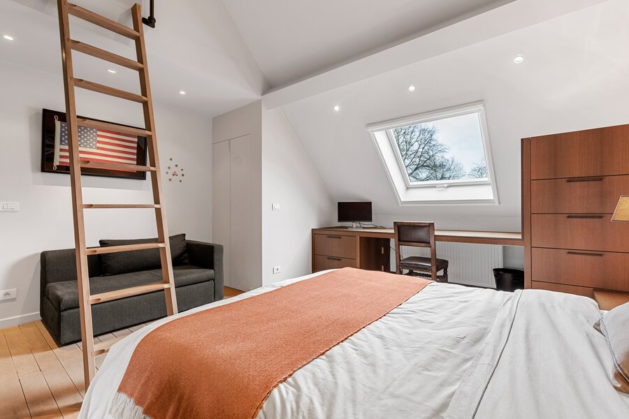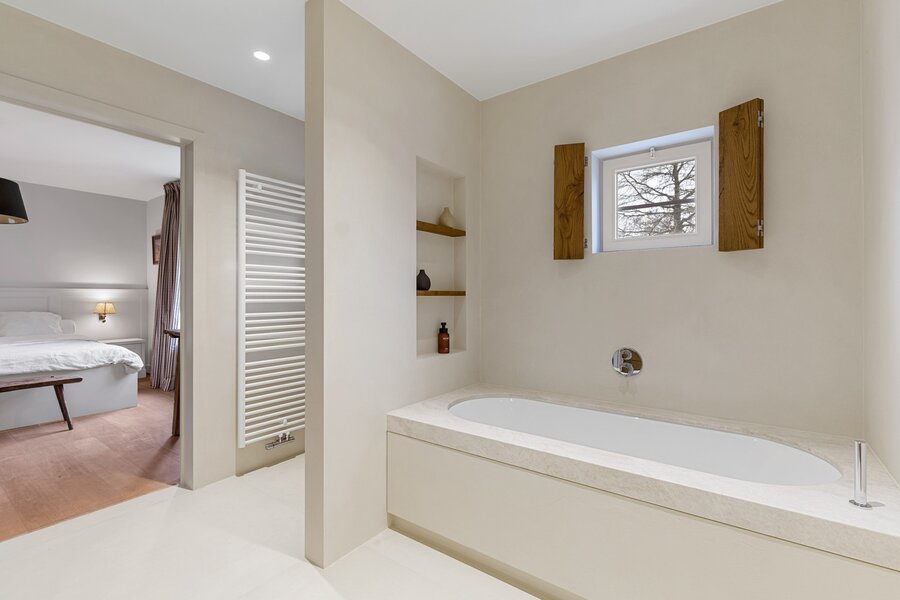 De eerste verdieping biedt een prachtige bureauruimte met een eigen bibliotheek. Dankzij de grote raampartijen geniet u hier van een fenomenaal uitzicht over uw domein. Verder vindt u nog twee ruime slaapkamers met een gedeelde badkamer en de masterbedroom met ensuite badkamer.