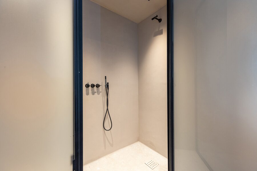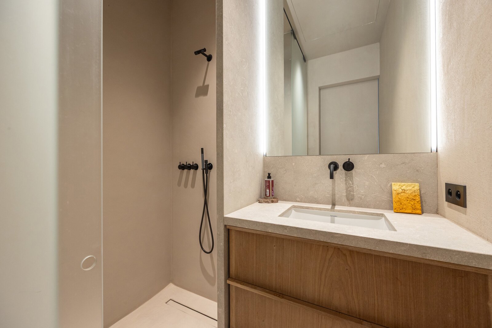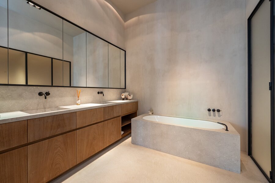Luxueuze badkamer van 12 m² afgewerkt in natuursteen en voorzien van ligbad, inloopdouche, dubbele lavabo, spiegelkasten en toilet.