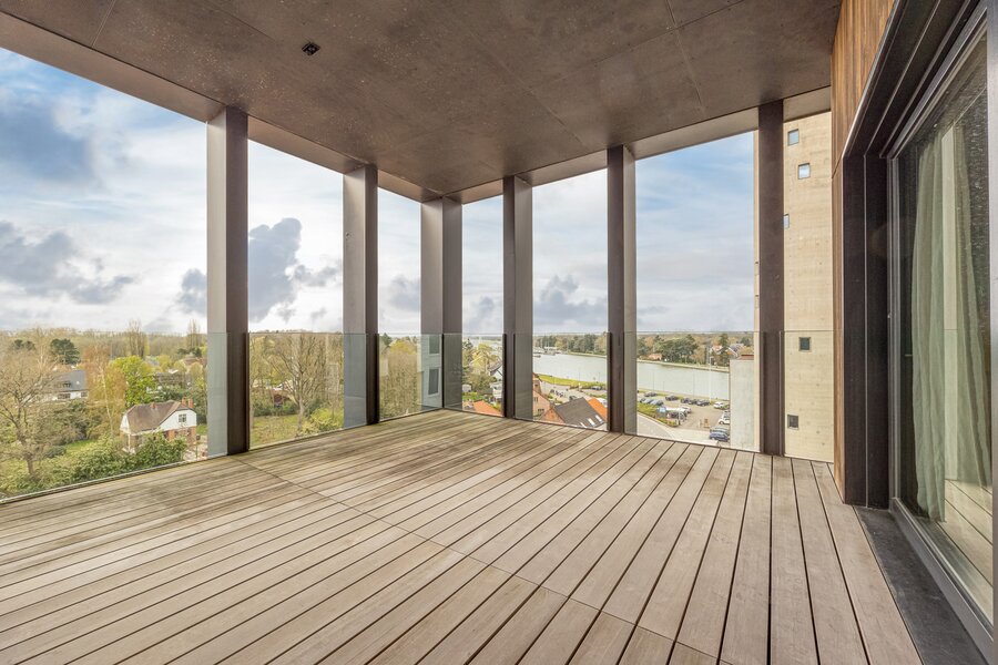 Ruim overdekt terras van 35 m² waar u in alle rust kan genieten van het open zicht en de unieke ligging aan het kanaal.
