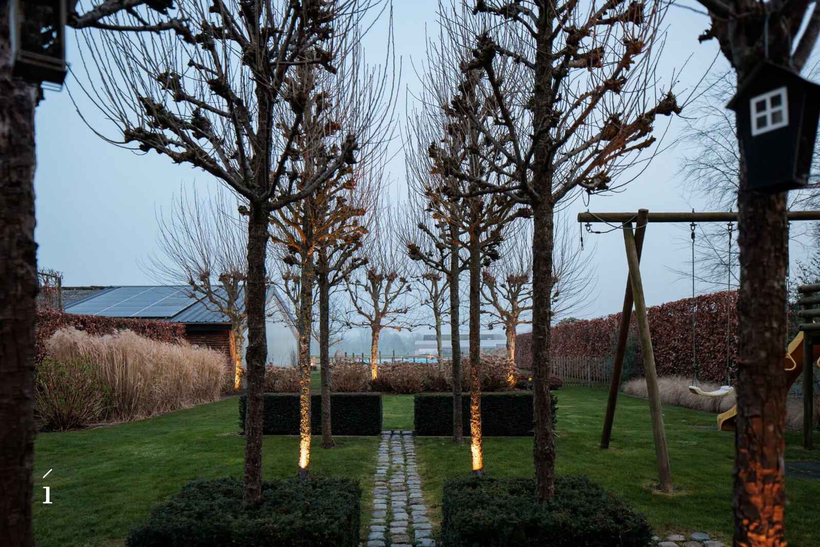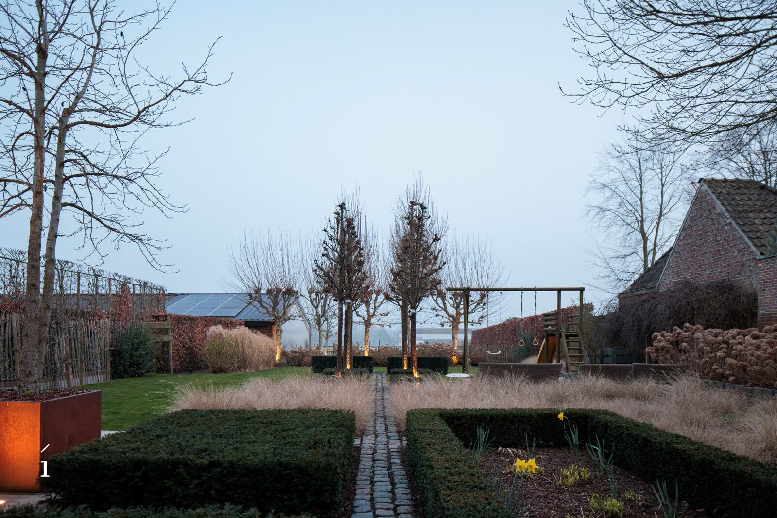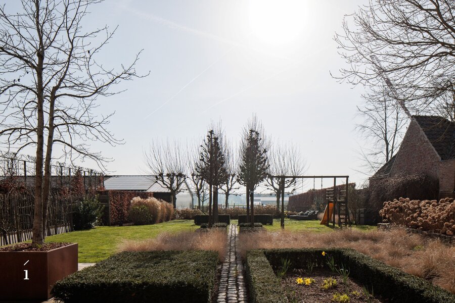 Buiten strekt zich een volgroeide tuin uit die rust en privacy uitstraalt. Volwassen bomen, zorgvuldig aangelegde beplanting en verschillende terrassen creëren een groene oase waar het heerlijk vertoeven is.