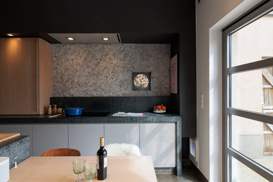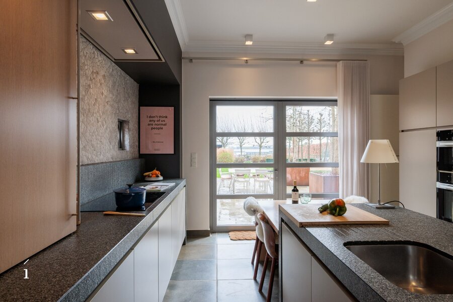 De volledig uitgeruste keuken met eetruimte vormt het kloppend hart van de woning, terwijl de ruime living uitnodigt tot ontspannen avonden bij het haardvuur.