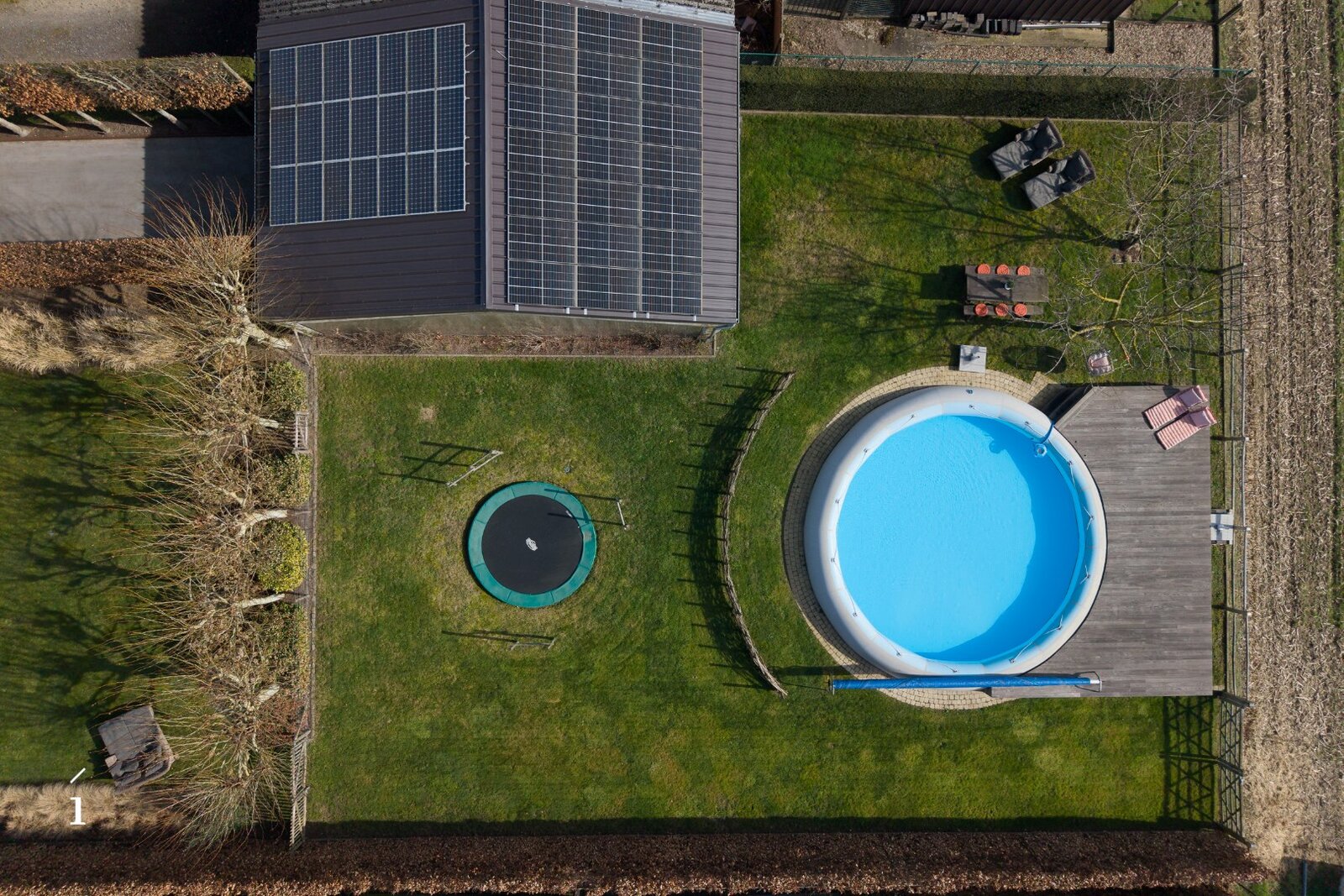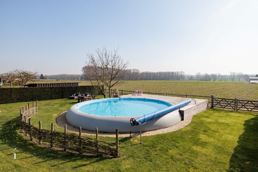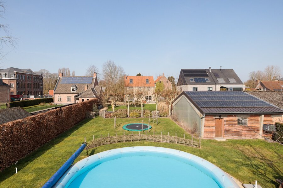 Achteraan de tuin bevindt zich een verwarmd zwembad met professionele zwembadinstallatie en zonnedek, een ideale plek om in de zomer samen te genieten met familie en vrienden.