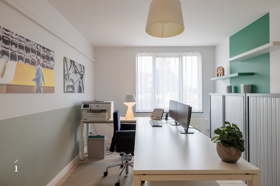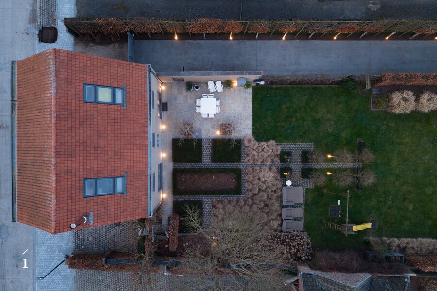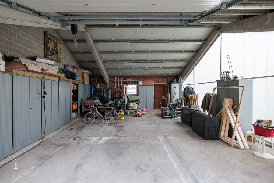 Een extra troef is het multifunctionele bijgebouw van circa 84 m² achteraan het perceel, uitgerust met zonnepanelen en alle voorzieningen om ingericht te worden als atelier, kantoor, garage of bijkomende woonruimte.